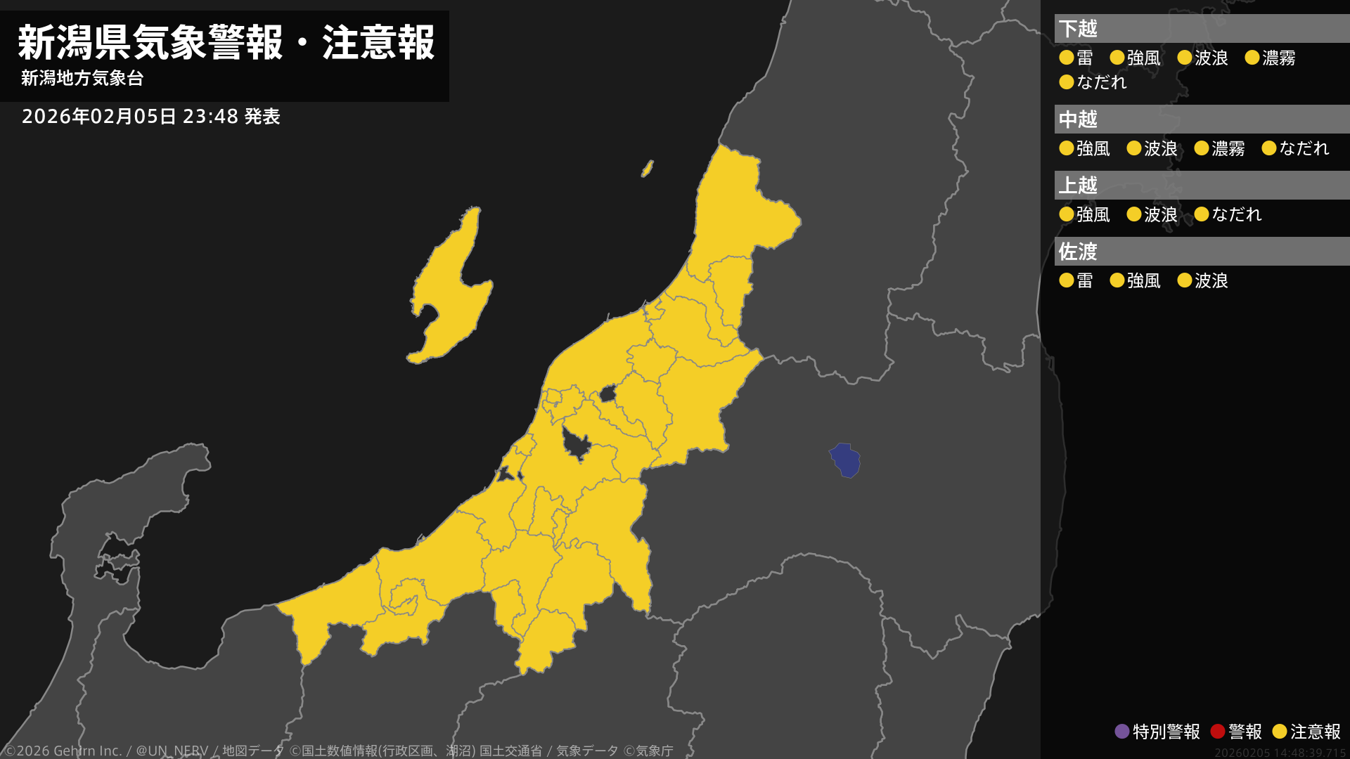 【新潟県 気象警報・注意報 2026年02月05日 23:48】新潟県では強風や高波に、下越、佐渡では落雷に、下越、中越では濃霧による視程障害に、下越、中越、上越ではなだれに注意してください。#気象警報注意報 #新潟県