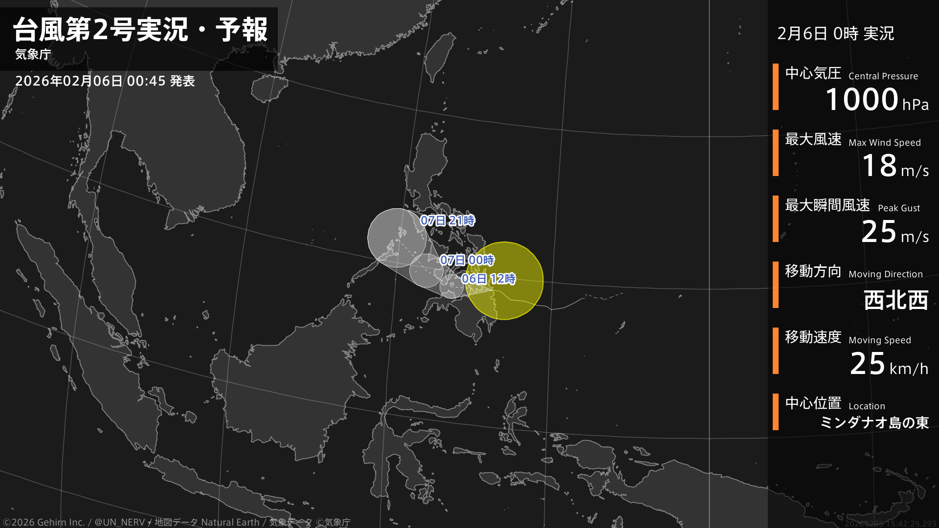 【台風第2号実況・予報 2026年02月06日 00:42】台風第2号(ペンニャ)は、ミンダナオ島の東を1時間に25キロの速さで西北西に進んでいます。#台風情報