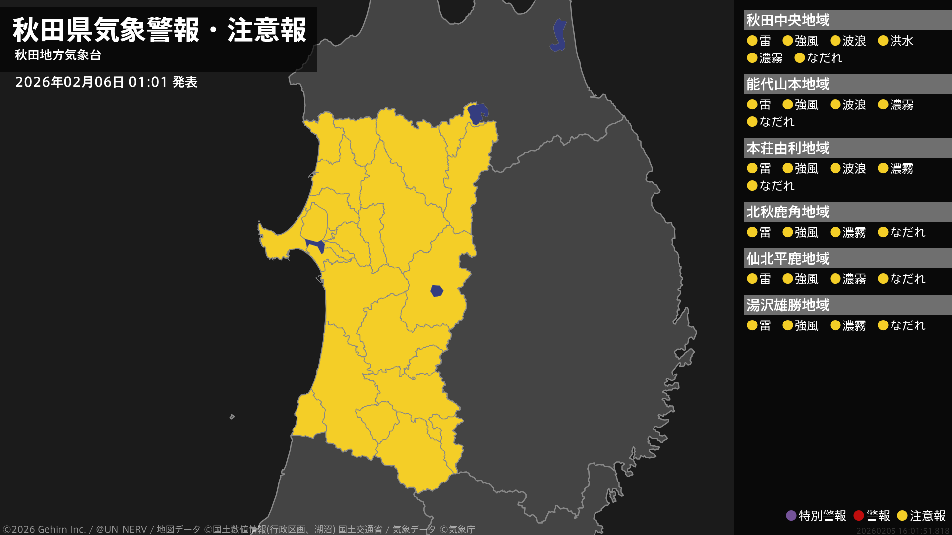 【秋田県 気象警報・注意報 2026年02月06日 01:01】沿岸では、河川の増水や高波に注意してください。秋田県では、強風や落雷、濃霧による視程障害、なだれに注意してください。#気象警報注意報 #秋田県