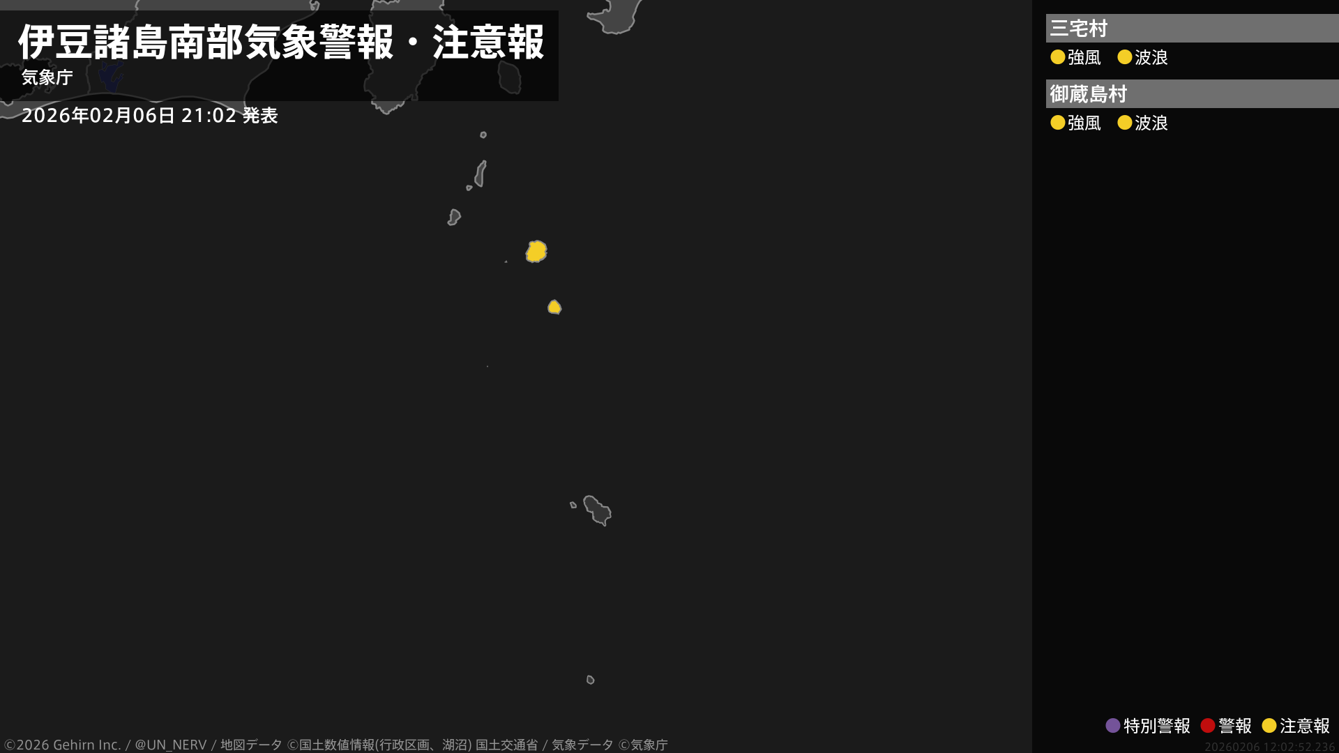【東京都 気象警報・注意報 2026年02月06日 21:02】東京地方、伊豆諸島北部、伊豆諸島南部では、強風や高波に注意してください。東京地方、伊豆諸島北部では、空気の乾燥した状態が続くため、火の取り扱いに注意してください。#気象警報注意報 #東京都