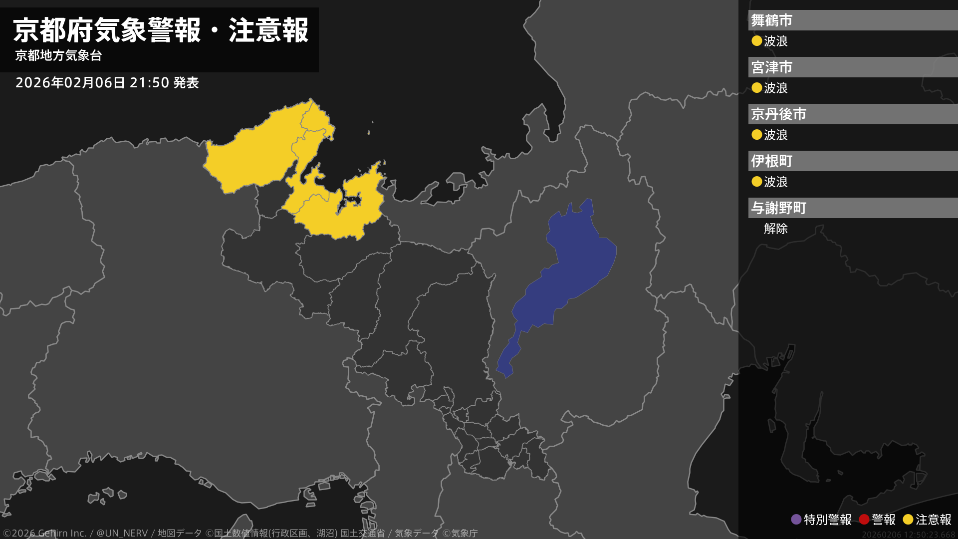 【京都府 気象警報・注意報 2026年02月06日 21:50】北部では、高波に注意してください。#気象警報注意報 #京都府