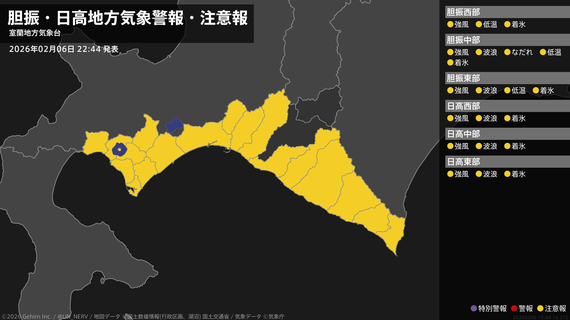 【胆振・日高地方 気象警報・注意報 2026年02月06日 22:44】胆振、日高地方では、強風や高波、着氷に注意してください。胆振地方では、なだれや低温に注意してください。#気象警報注意報 #胆振地方 #日高地方