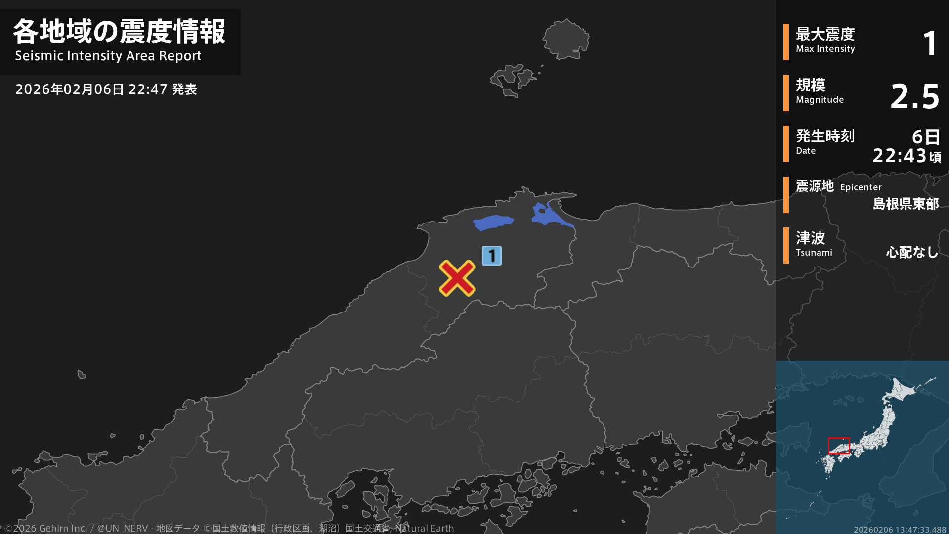 【地震情報 2026年2月6日】22時43分頃、島根県東部を震源とする地震がありました。震源の深さは約10km、地震の規模はM2.5、最大震度1を島根県で観測しています。この地震による津波の心配はありません。#地震 #島根県