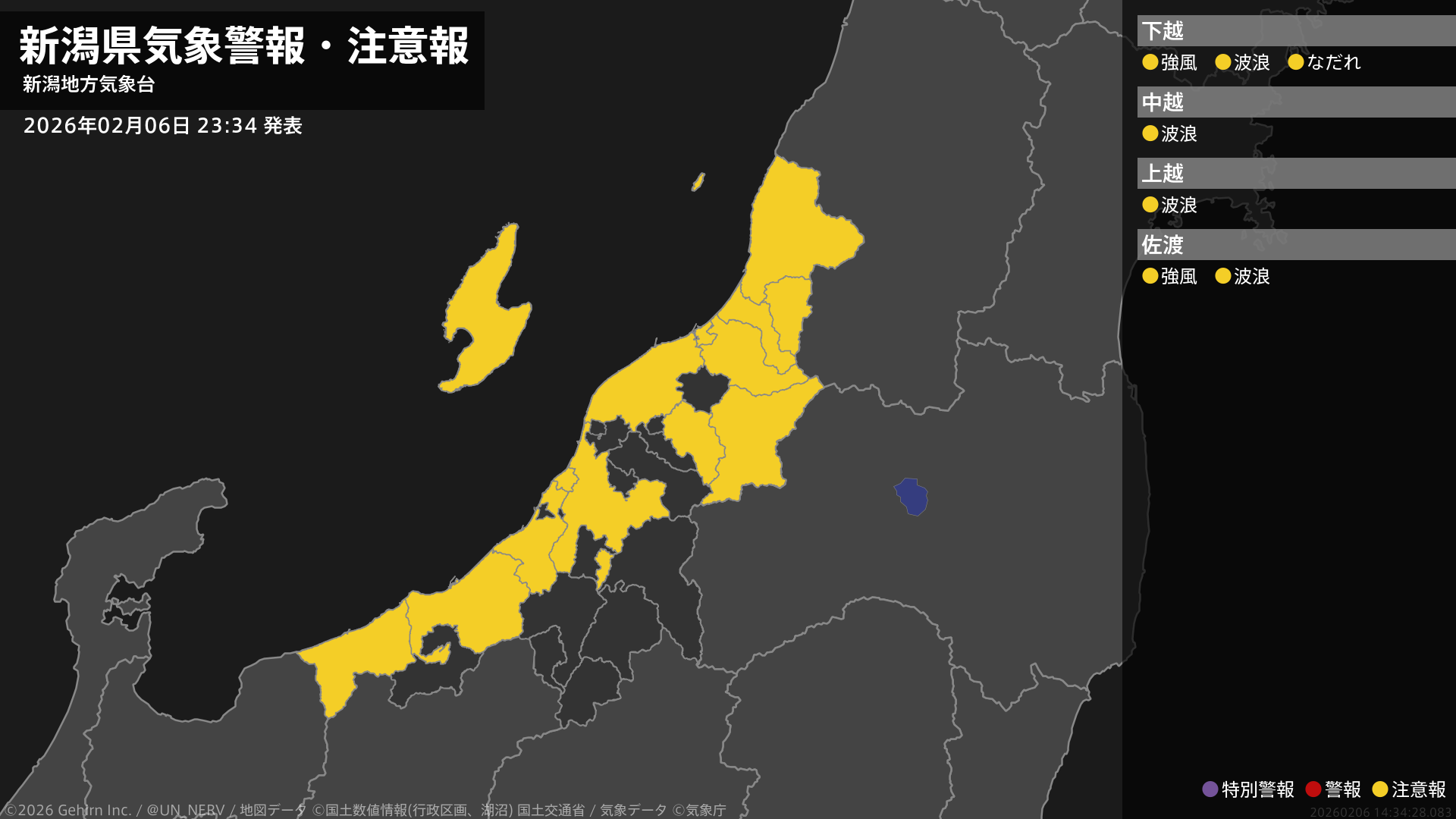 【新潟県 気象警報・注意報 2026年02月06日 23:34】下越、佐渡では、強風に注意してください。新潟県では、高波に注意してください。下越では、なだれに注意してください。#気象警報注意報 #新潟県