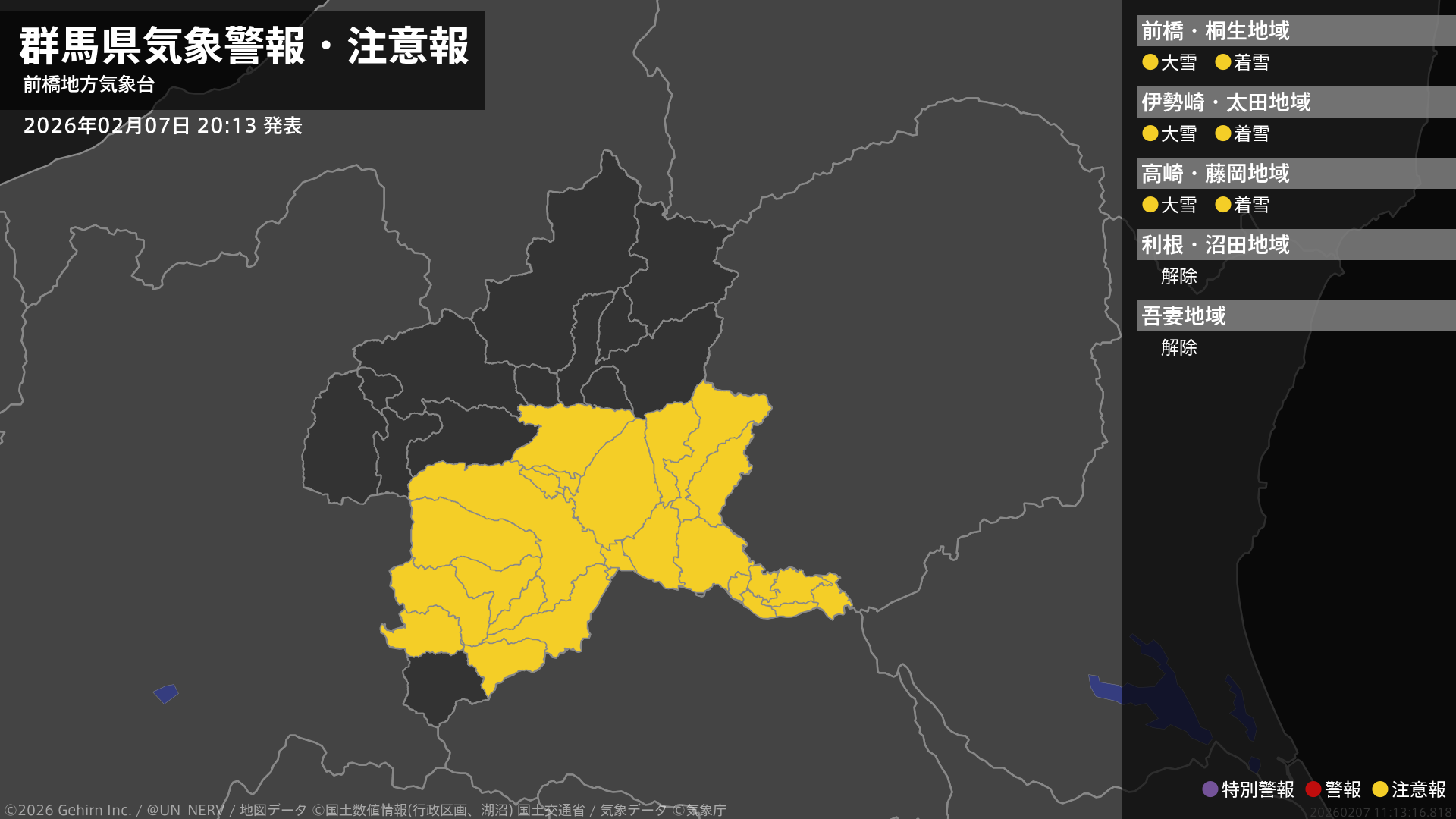 【群馬県 気象警報・注意報 2026年02月07日 20:13】南部では、7日夜遅くから8日昼前まで大雪や電線等への着雪に注意してください。#気象警報注意報 #群馬県
