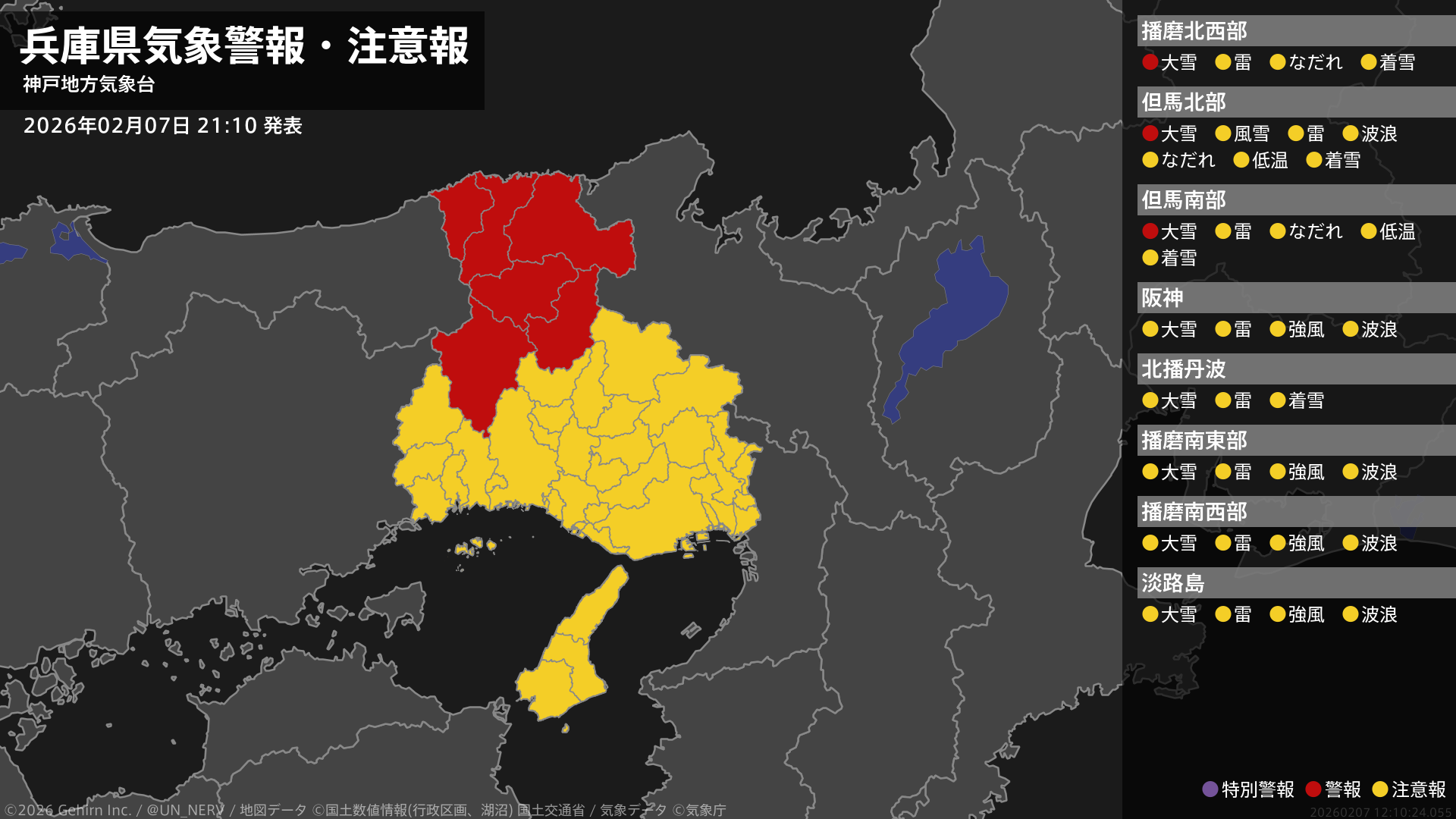 【兵庫県 気象警報・注意報 2026年02月07日 21:10】兵庫県では、8日明け方から8日夜のはじめ頃まで大雪に警戒してください。#気象警報注意報 #兵庫県