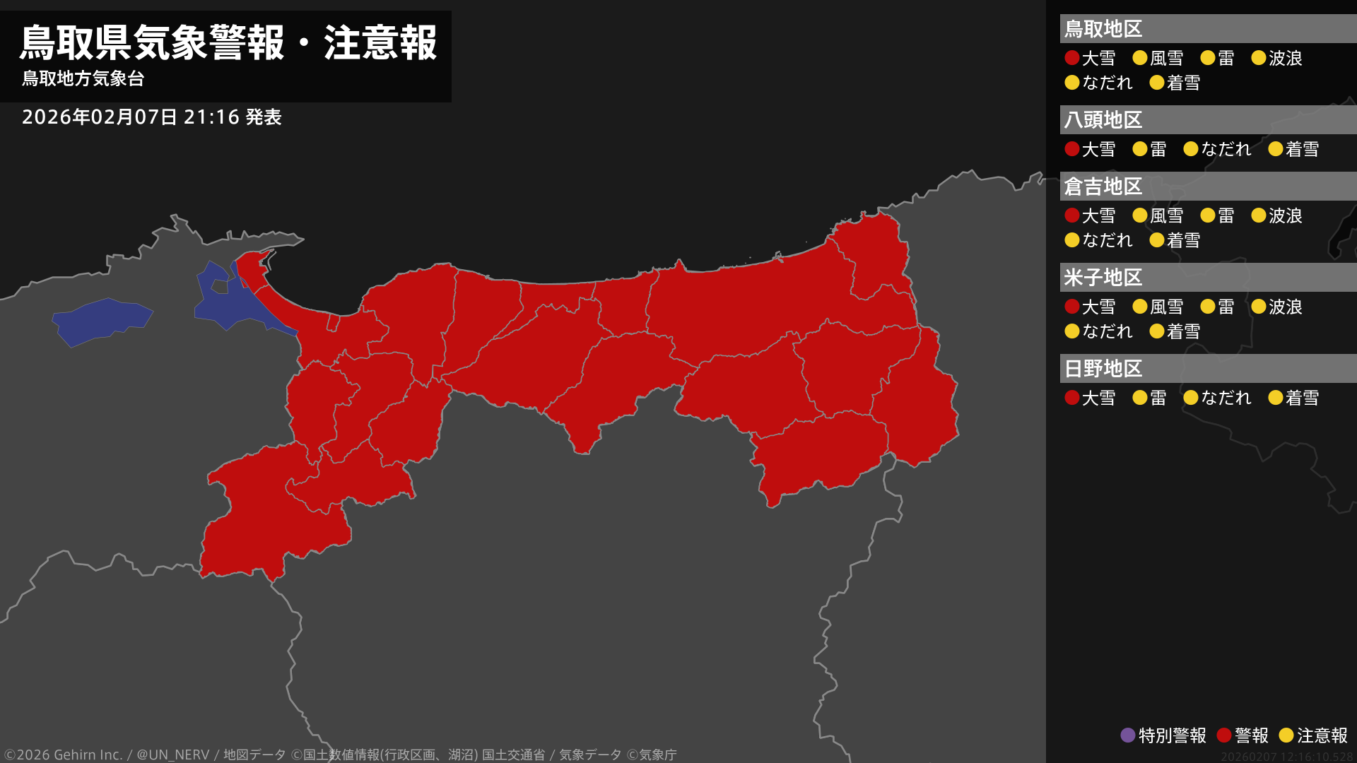 【鳥取県 気象警報・注意報 2026年02月07日 21:16】鳥取県では、8日明け方から8日夜のはじめ頃まで大雪に警戒してください。#気象警報注意報 #鳥取県