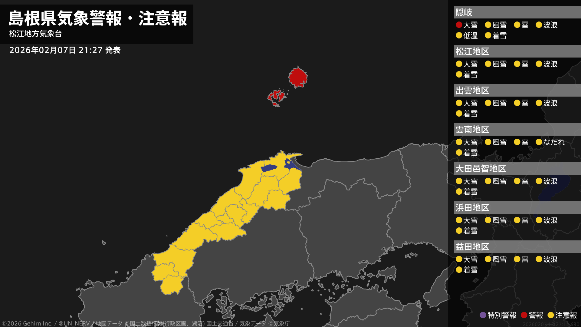 【島根県 気象警報・注意報 2026年02月07日 21:27】隠岐では、8日明け方から8日昼前まで大雪に警戒してください。#気象警報注意報 #島根県