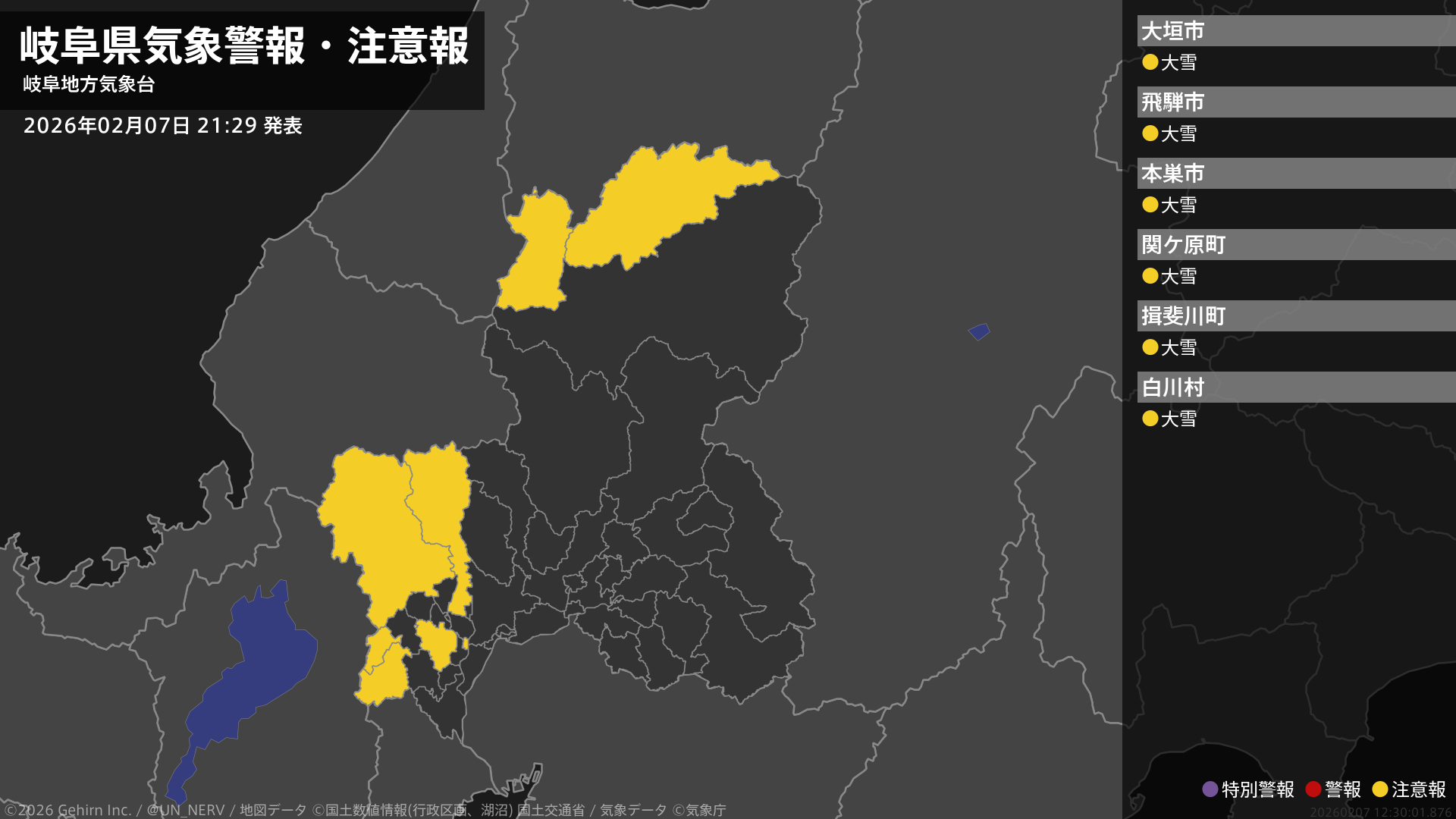 【岐阜県 気象警報・注意報 2026年02月07日 21:30】美濃地方では8日朝から8日昼前まで、飛騨地方では8日朝から、大雪に注意してください。#気象警報注意報 #岐阜県