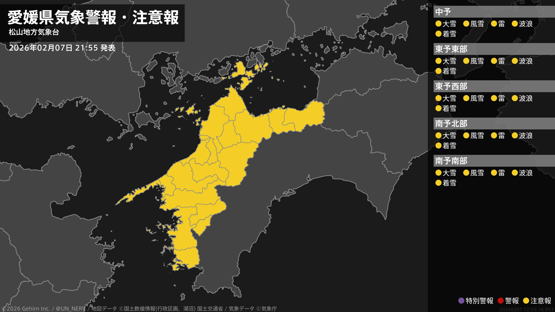 【愛媛県 気象警報・注意報 2026年02月07日 21:55】愛媛県では、8日夜遅くまで風雪や高波に、8日明け方から大雪や電線等への着雪に、8日明け方から8日夜遅くまで落雷に注意してください。#気象警報注意報 #愛媛県