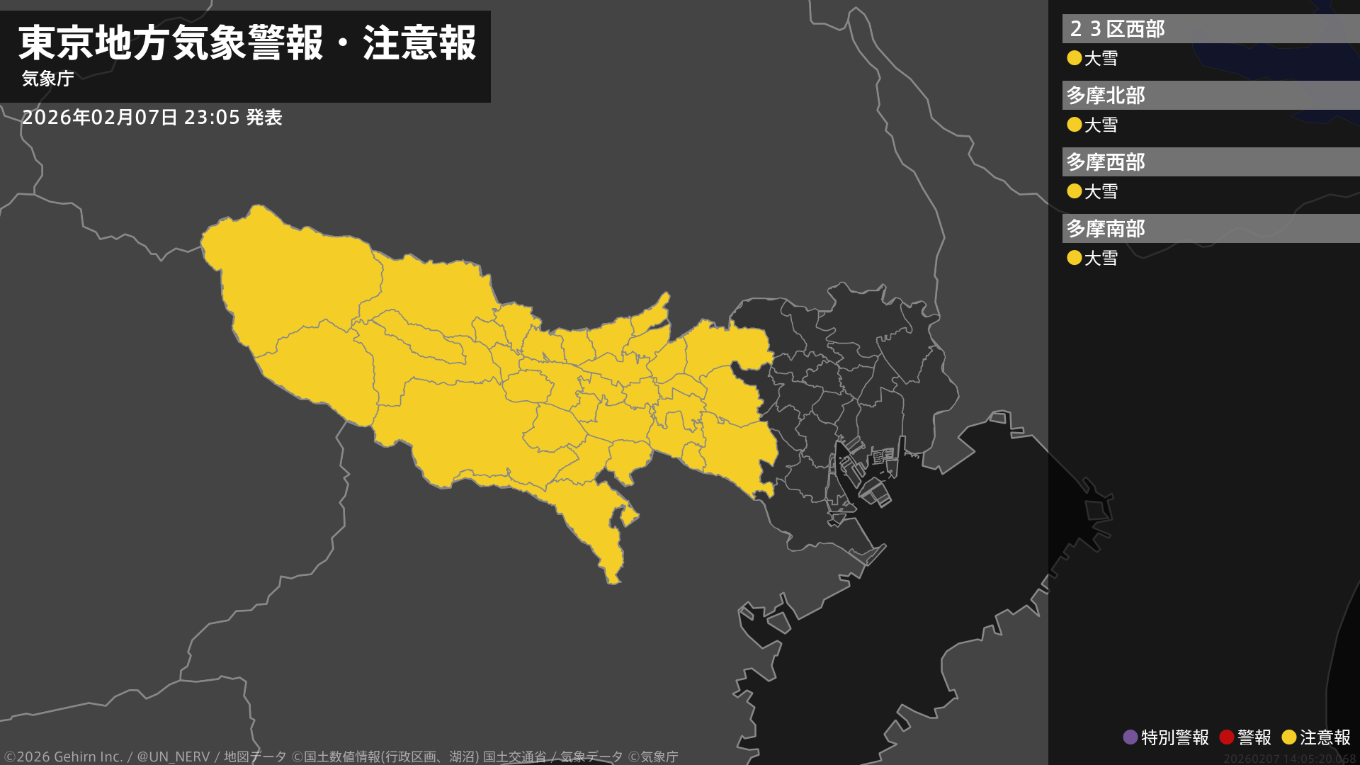 【東京都 気象警報・注意報 2026年02月07日 23:05】伊豆諸島北部、伊豆諸島南部では、強風や高波に注意してください。東京地方では、大雪に注意してください。伊豆諸島北部では、急な強い雨や落雷、霜に対する農作物の管理に注意してください。#気象警報注意報 #東京都