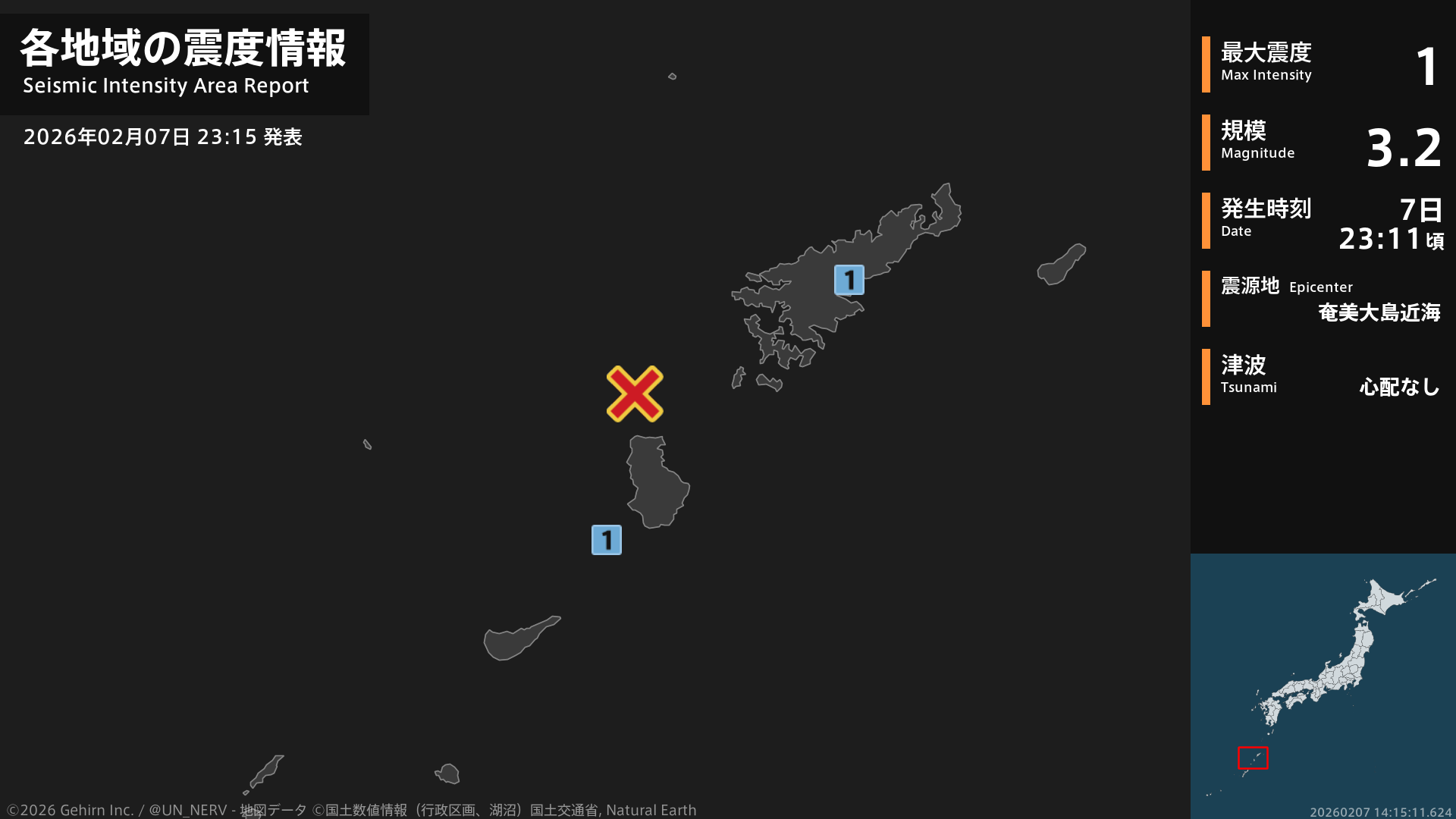 【地震情報 2026年2月7日】23時11分頃、奄美大島近海を震源とする地震がありました。震源の深さは約40km、地震の規模はM3.2、最大震度1を鹿児島県で観測しています。この地震による津波の心配はありません。#地震 #鹿児島県