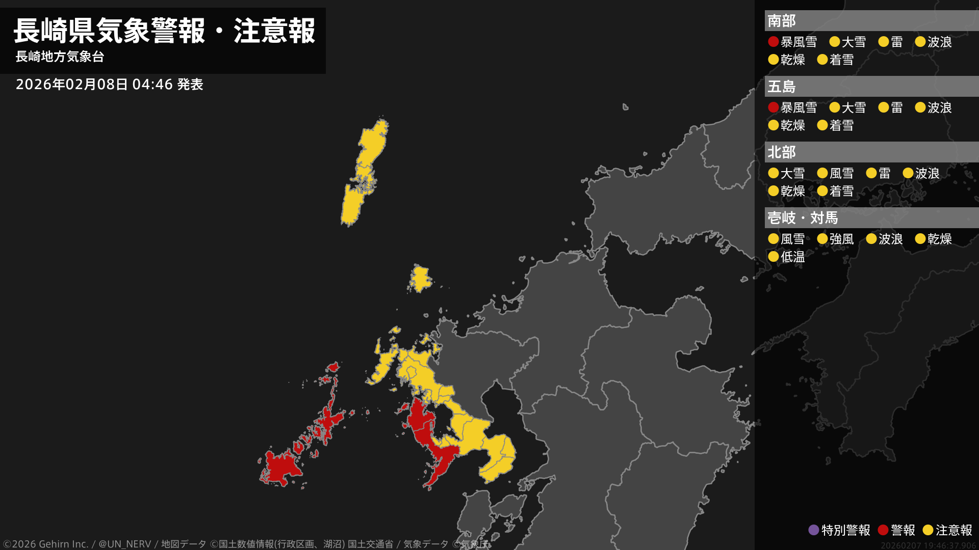 【長崎県 気象警報・注意報 2026年02月08日 04:46】