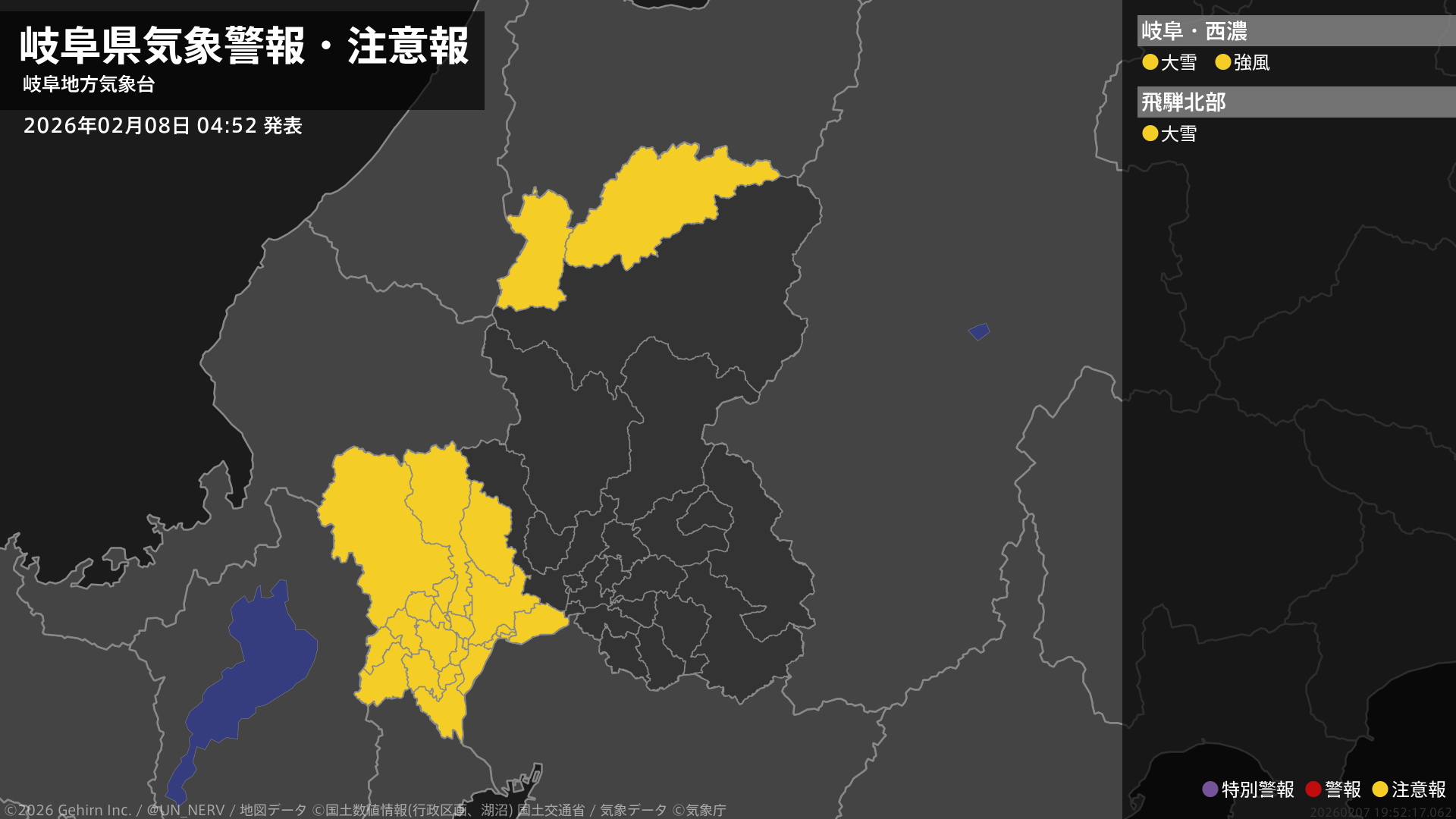 【岐阜県 気象警報・注意報 2026年02月08日 04:52】