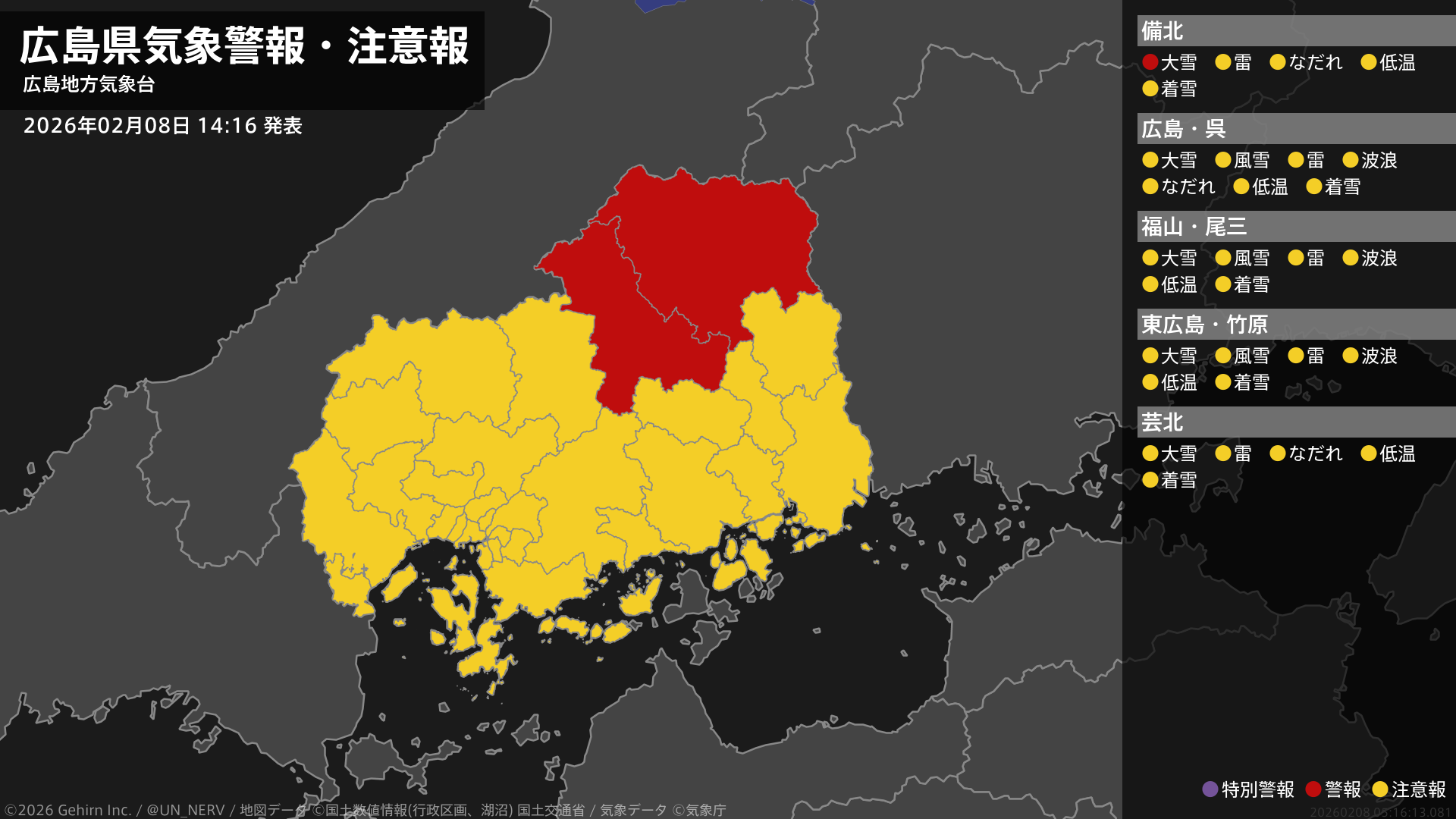 【広島県 気象警報・注意報 2026年02月08日 14:16】北部では、8日夜のはじめ頃まで大雪に警戒してください。#気象警報注意報 #広島県