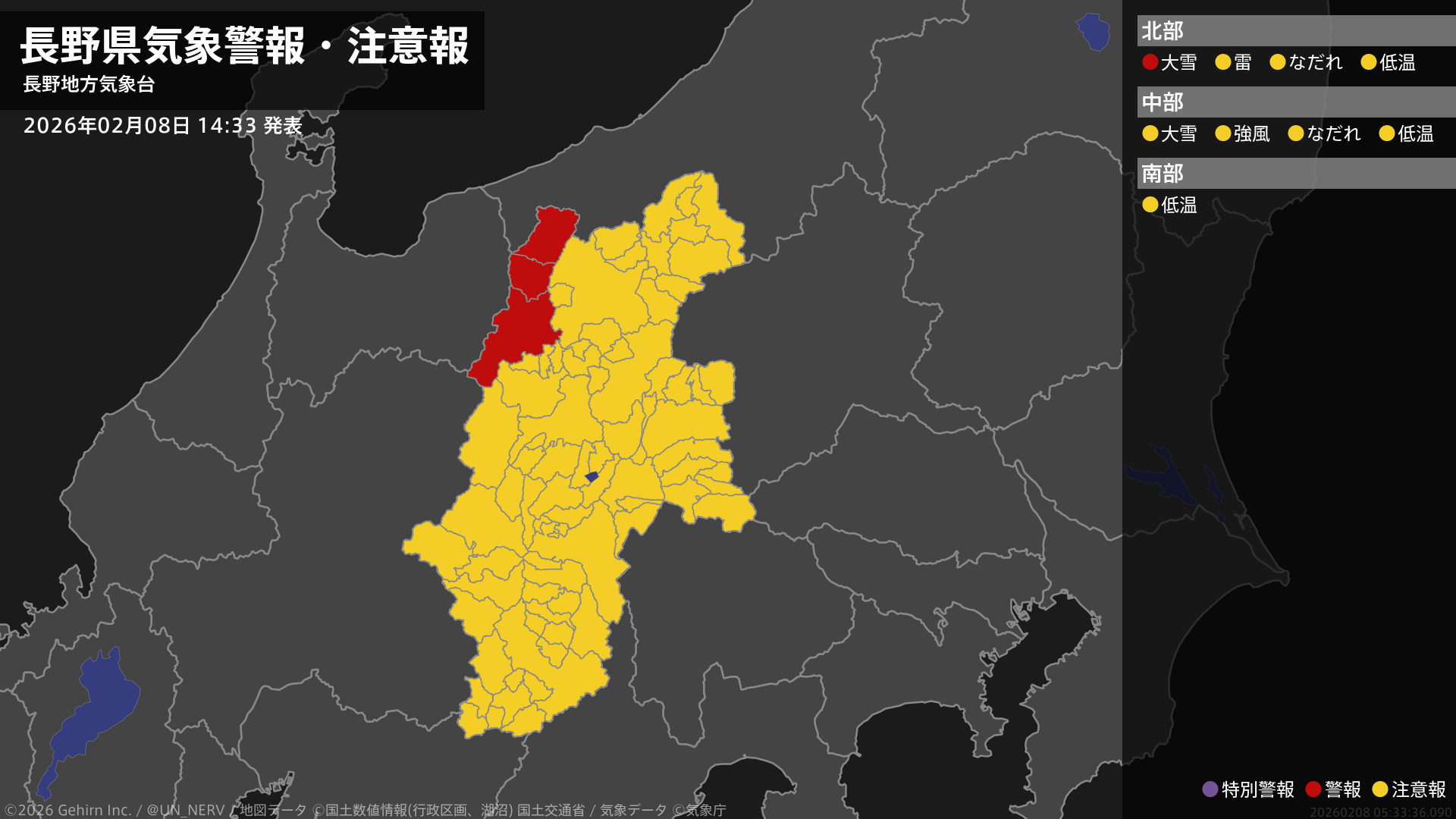 【長野県 気象警報・注意報 2026年02月08日 14:33】北部では、8日夜遅くまで大雪に警戒してください。#気象警報注意報 #長野県