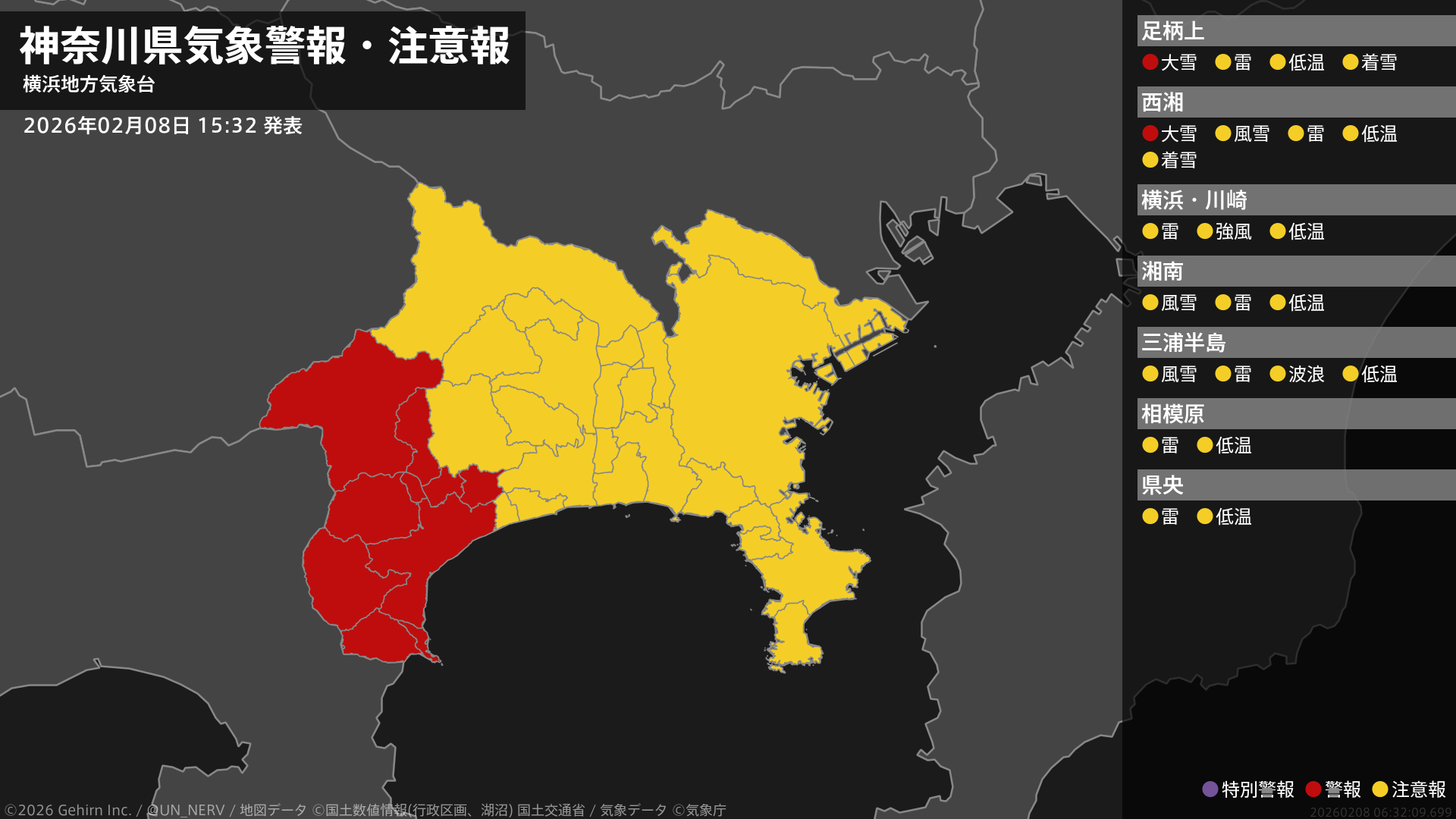 【神奈川県 気象警報・注意報 2026年02月08日 15:32】西部では、8日夕方まで大雪に警戒してください。#気象警報注意報 #神奈川県
