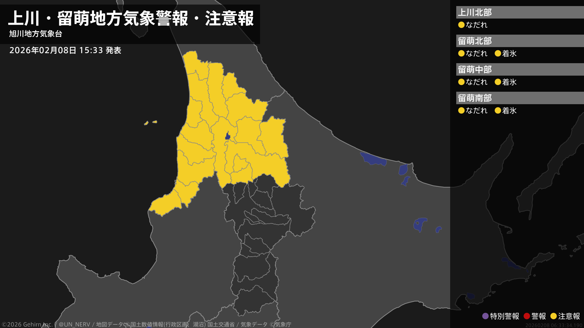 【上川・留萌地方 気象警報・注意報 2026年02月08日 15:33】上川、留萌地方では、9日までなだれに注意してください。留萌地方では、9日昼前まで着氷に注意してください。#気象警報注意報 #上川地方 #留萌地方