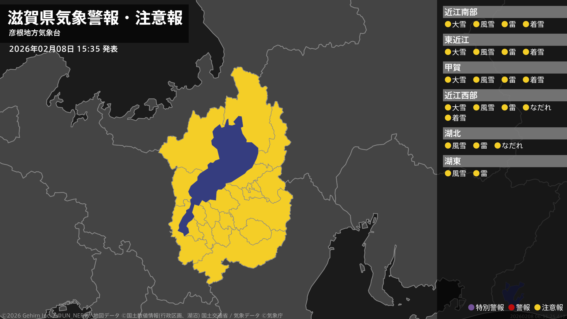【滋賀県 気象警報・注意報 2026年02月08日 15:35】滋賀県では、9日夕方まで風雪に、9日明け方まで大雪や電線等への着雪に、8日夜遅くまで竜巻などの激しい突風や落雷に注意してください。北部では、9日までなだれに注意してください。#気象警報注意報 #滋賀県