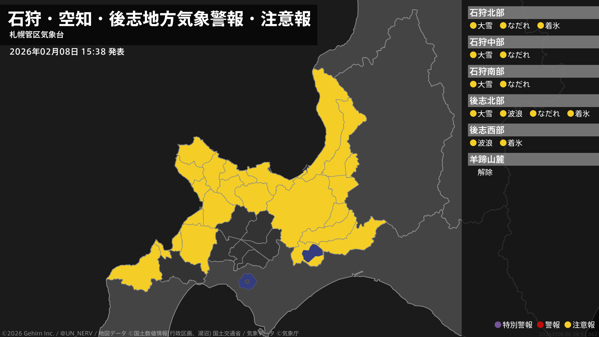 【石狩・空知・後志地方 気象警報・注意報 2026年02月08日 15:38】石狩、後志地方では、大雪やなだれ、着氷に注意してください。後志地方では、高波に注意してください。#気象警報注意報 #石狩地方 #後志地方