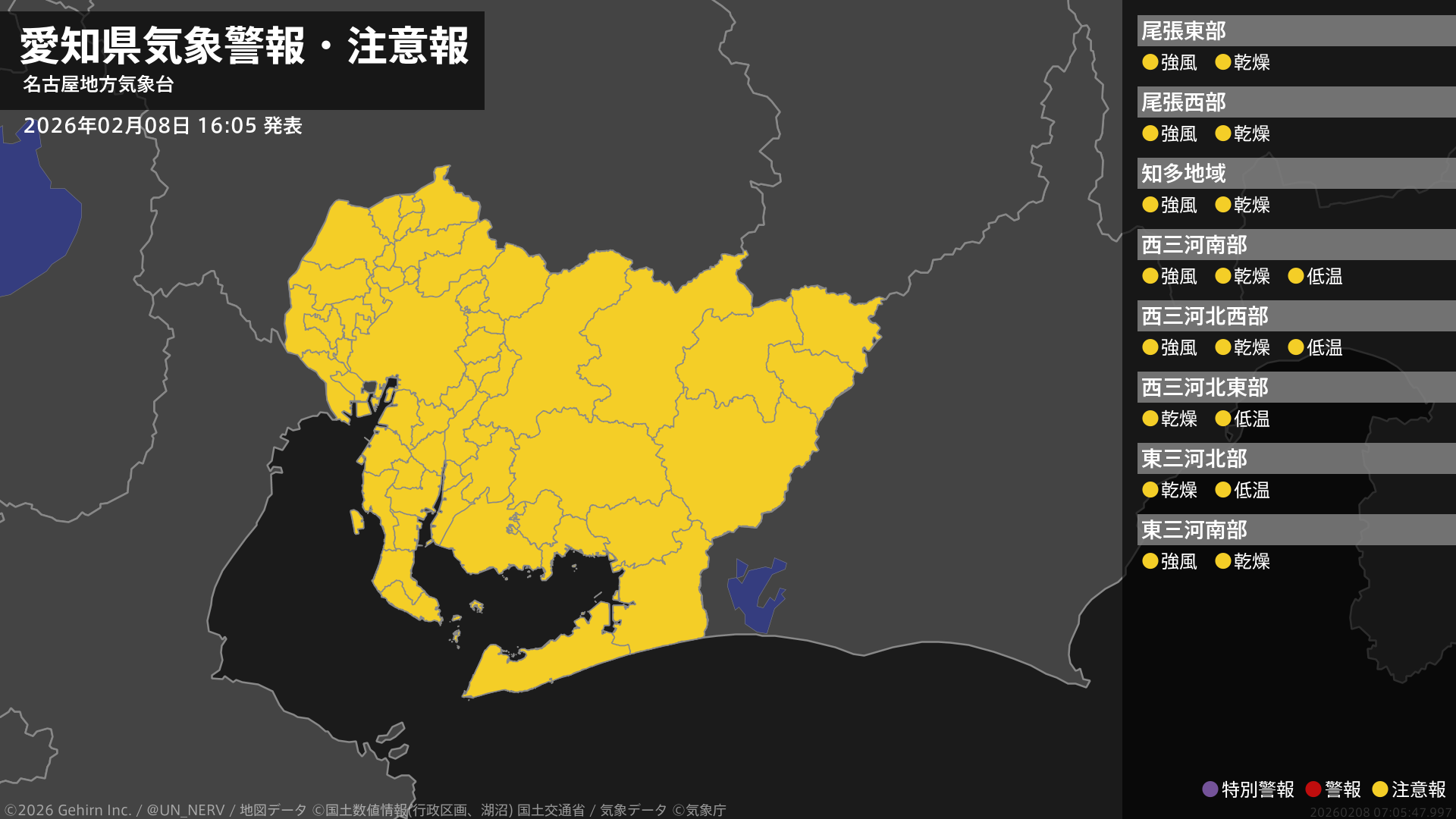 【愛知県 気象警報・注意報 2026年02月08日 16:05】愛知県では、8日夜遅くまで強風に、9日まで乾燥や低温に注意してください。#気象警報注意報 #愛知県