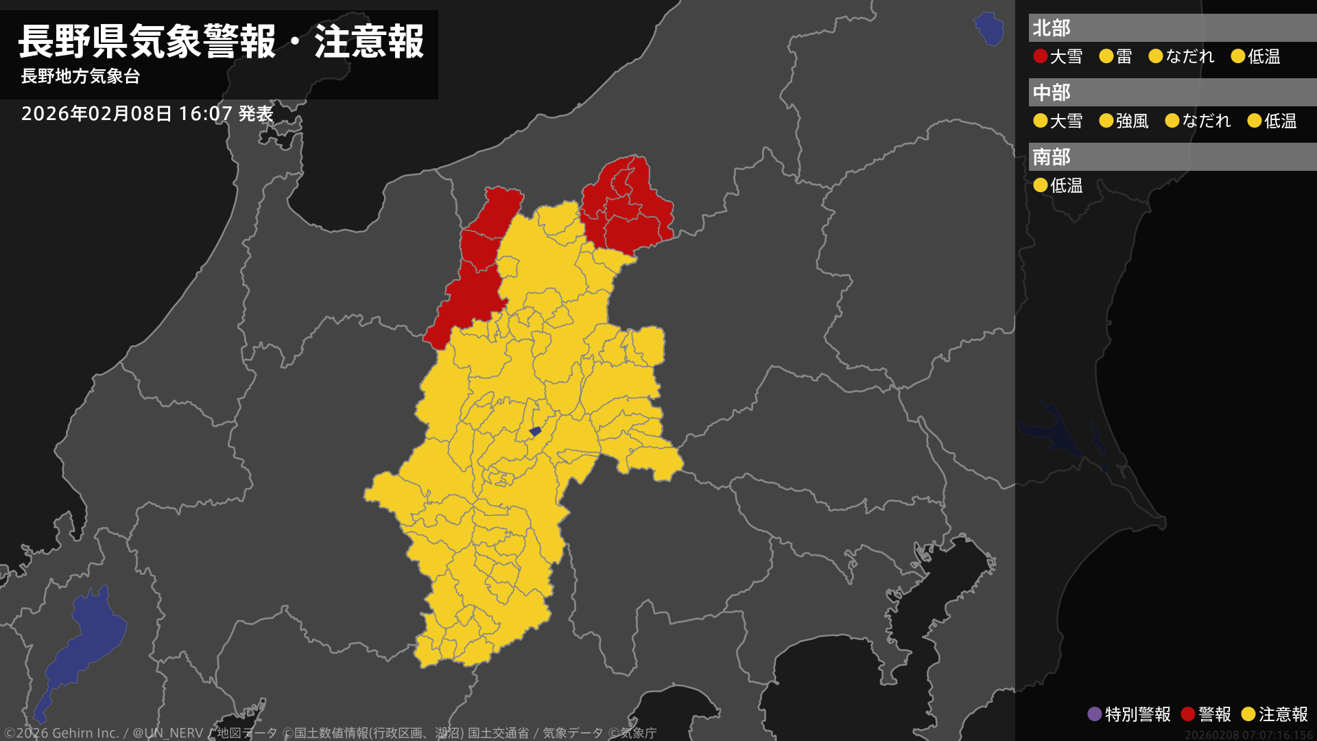 【長野県 気象警報・注意報 2026年02月08日 16:07】北部では、9日明け方まで大雪に警戒してください。#気象警報注意報 #長野県