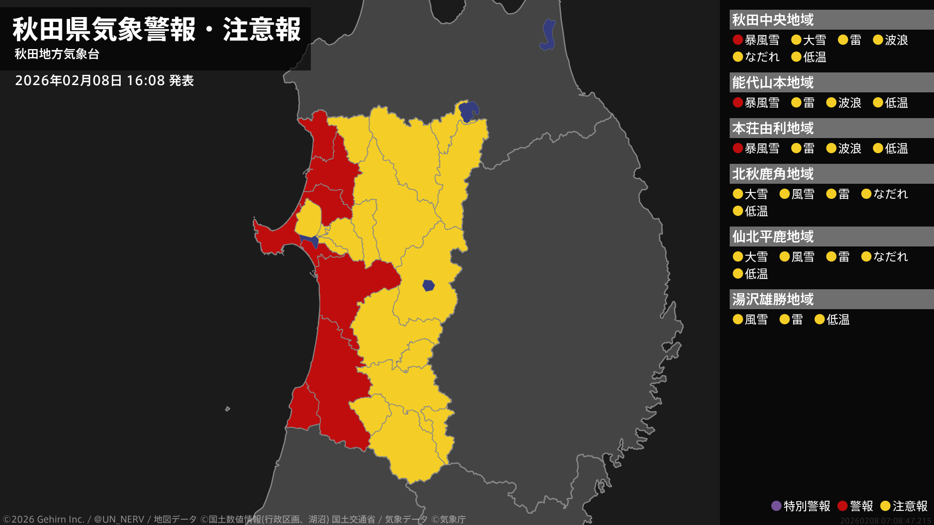 【秋田県 気象警報・注意報 2026年02月08日 16:08】秋田県の海上では、8日夜遅くまで暴風雪に警戒してください。#気象警報注意報 #秋田県