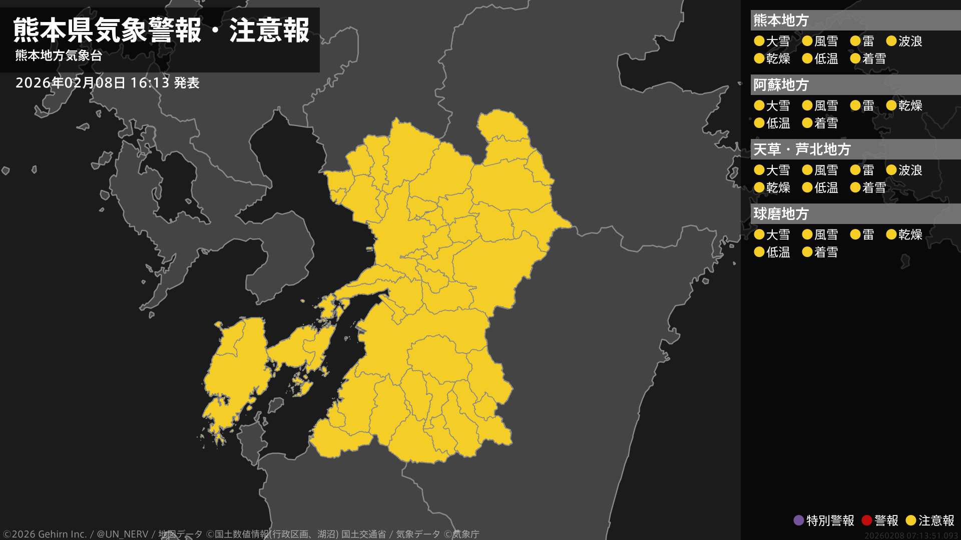 【熊本県 気象警報・注意報 2026年02月08日 16:13】熊本県では、風雪や大雪、高波、落雷、乾燥、低温、電線等への着雪に注意してください。#気象警報注意報 #熊本県