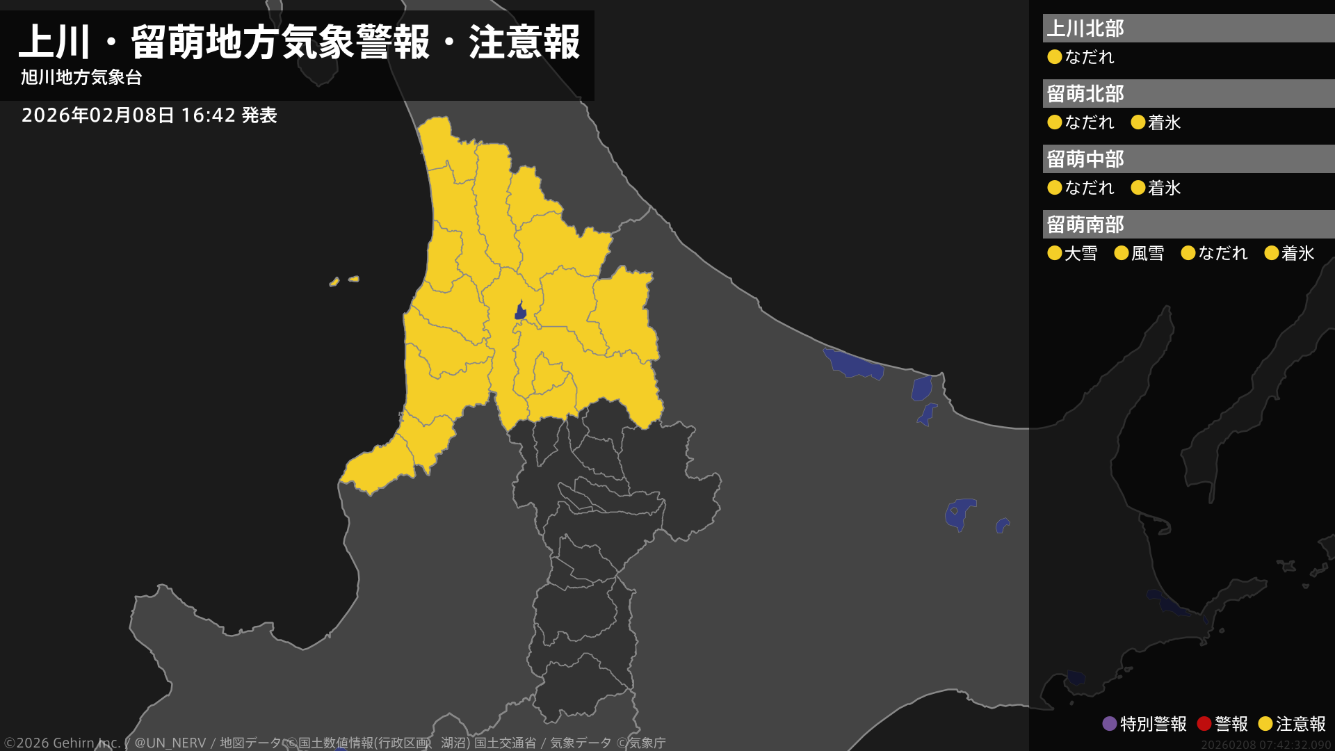 【上川・留萌地方 気象警報・注意報 2026年02月08日 16:42】