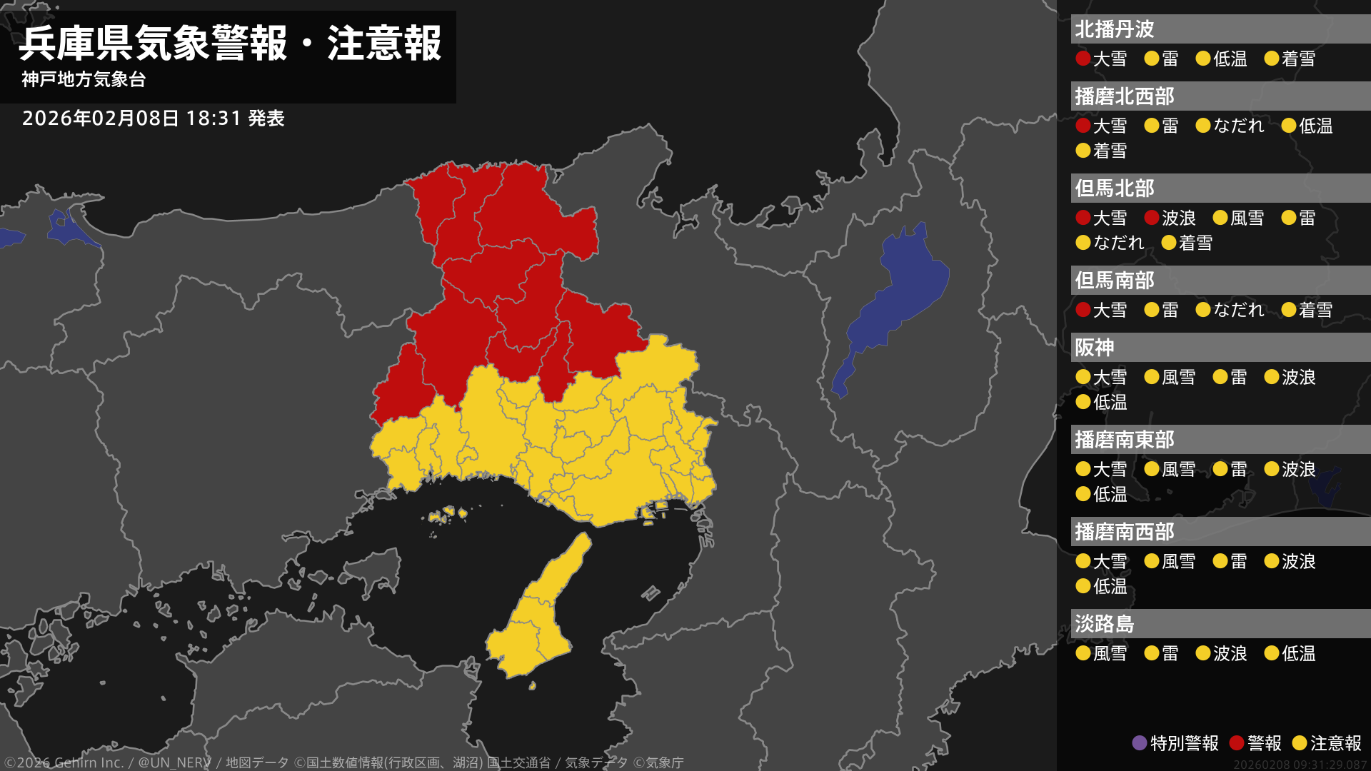 【兵庫県 気象警報・注意報 2026年02月08日 18:31】