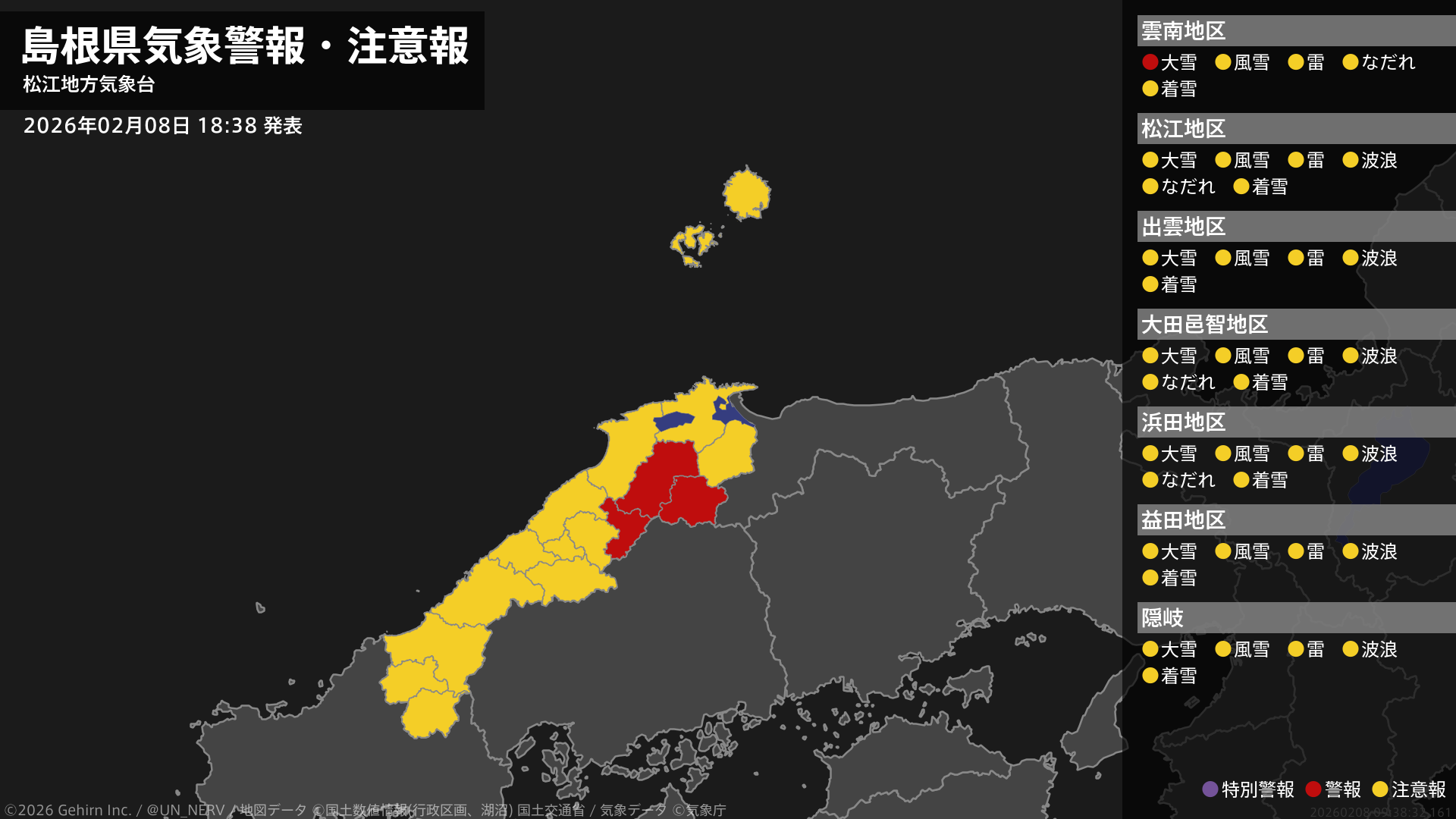 【島根県 気象警報・注意報 2026年02月08日 18:38】