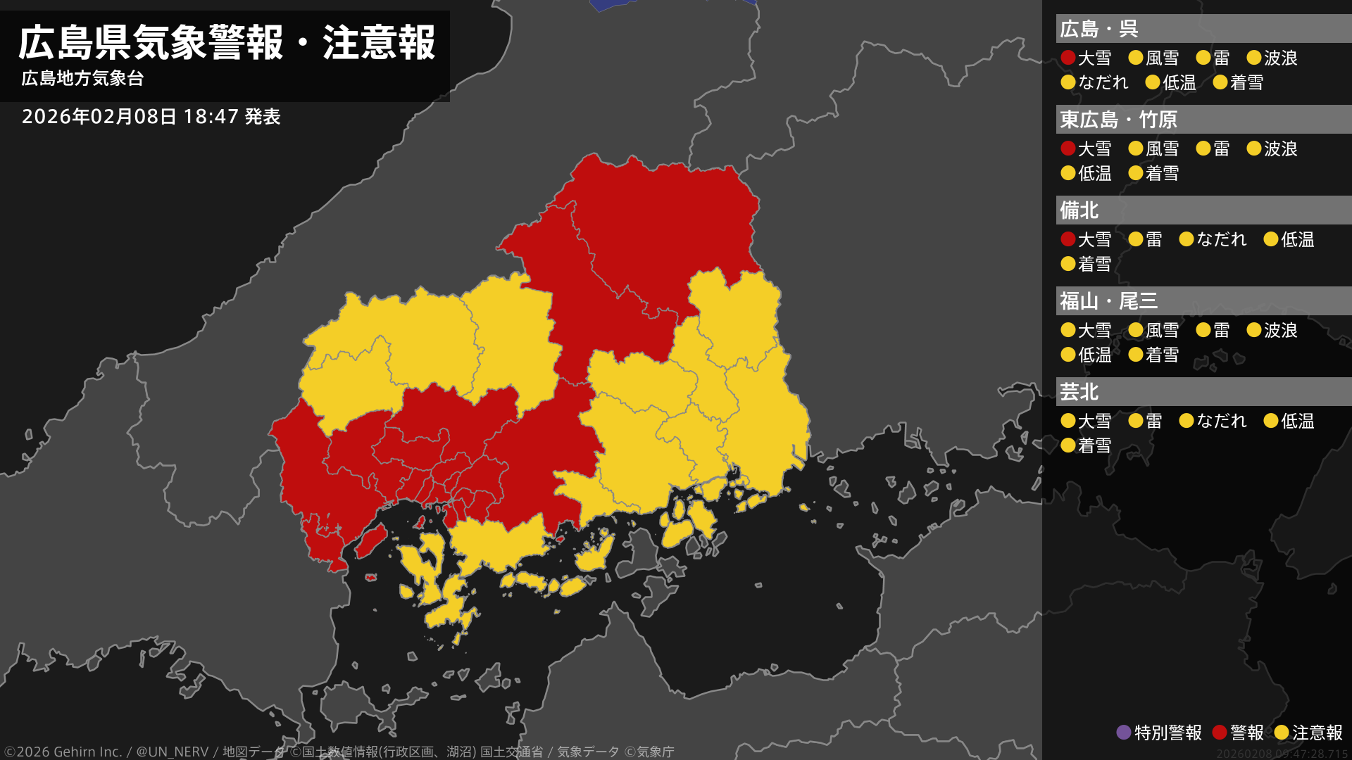 【広島県 気象警報・注意報 2026年02月08日 18:47】