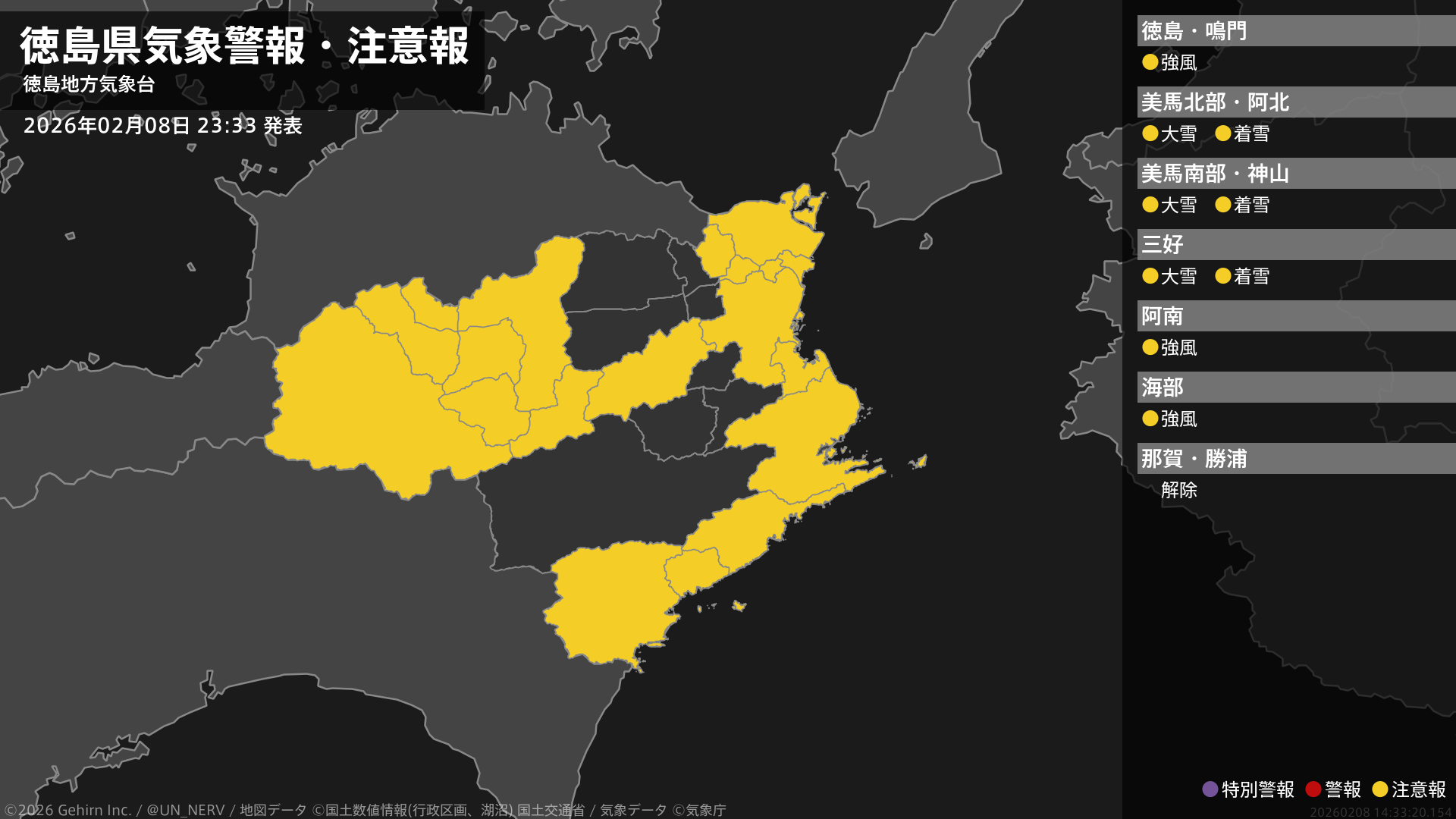 【徳島県 気象警報・注意報 2026年02月08日 23:33】徳島県では、9日明け方まで強風に注意してください。北部では、9日明け方まで大雪や電線等への着雪に注意してください。#気象警報注意報 #徳島県