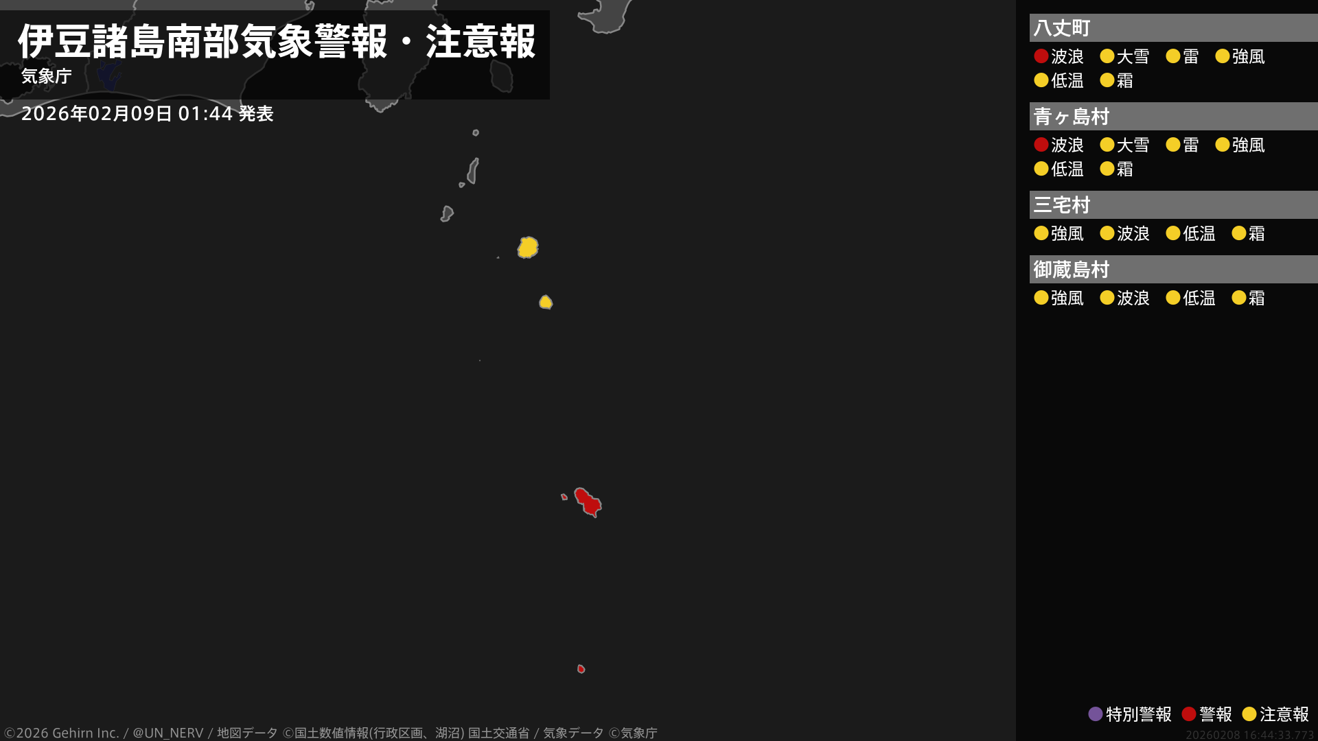 【東京都 気象警報・注意報 2026年02月09日 01:44】伊豆諸島南部では9日昼前まで、小笠原諸島では9日明け方から9日夕方まで、高波に警戒してください。#気象警報注意報 #東京都