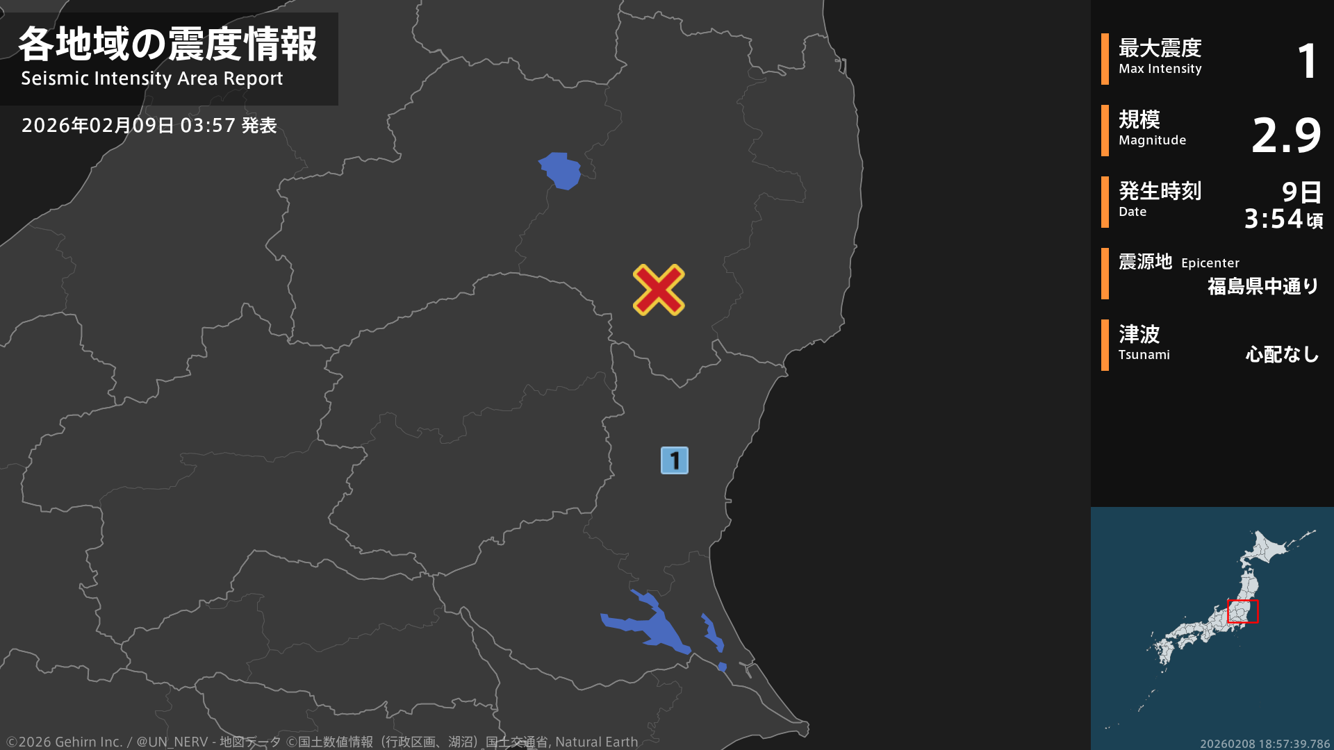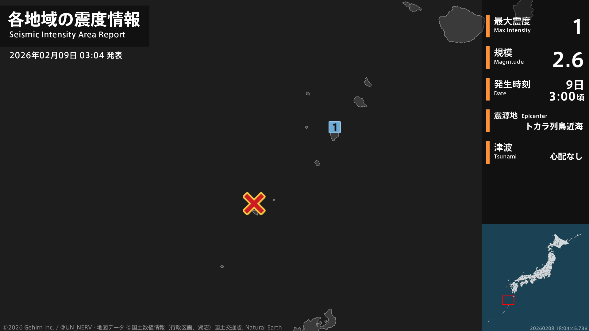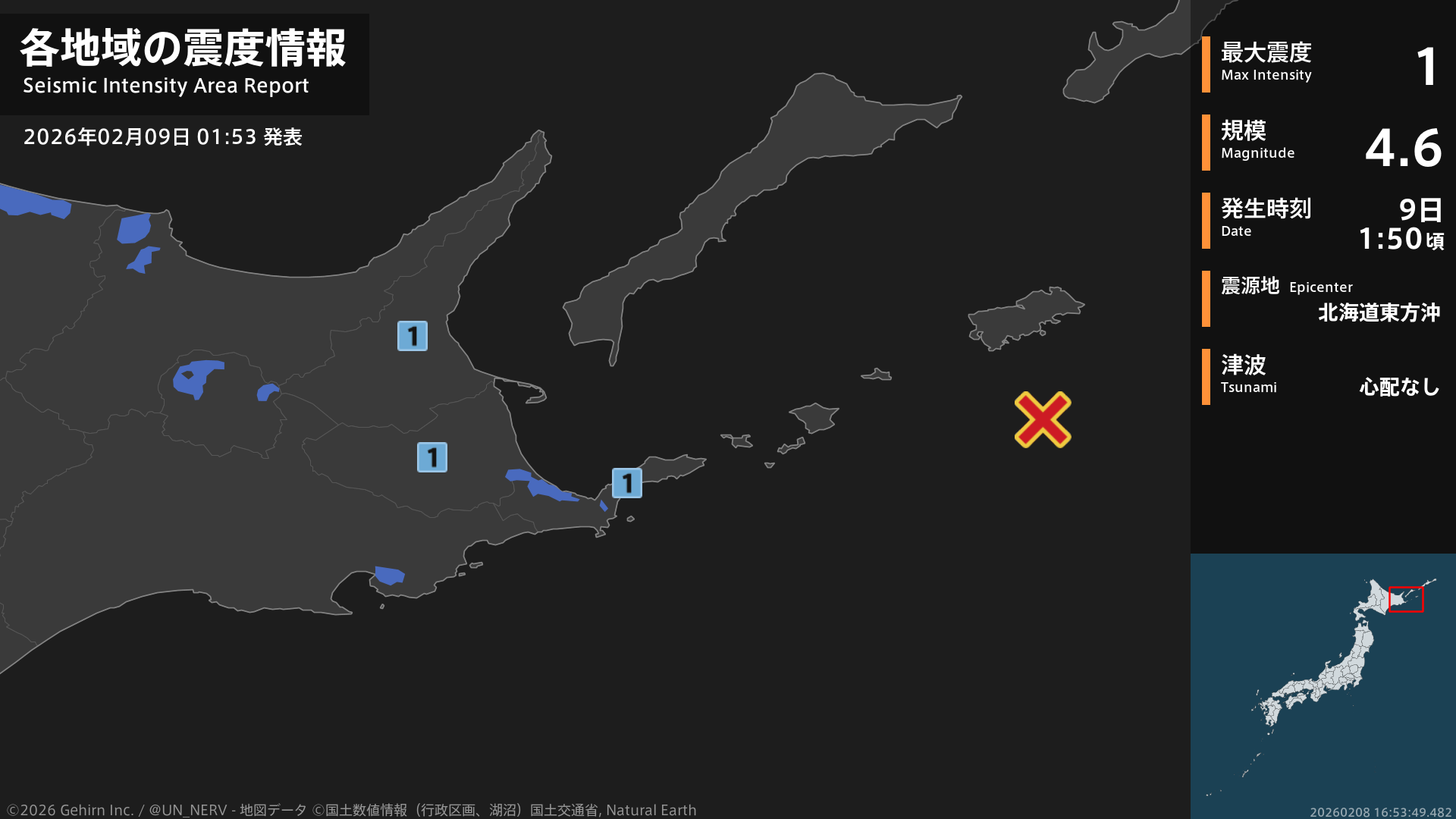 1時50分頃、北海道東方沖を震源とする地震がありました。地震の規模はM4.5程度、最大震度2程度と推定されています。この情報は気象庁の予報に基づく推定です。情報は誤差を含む場合があります。