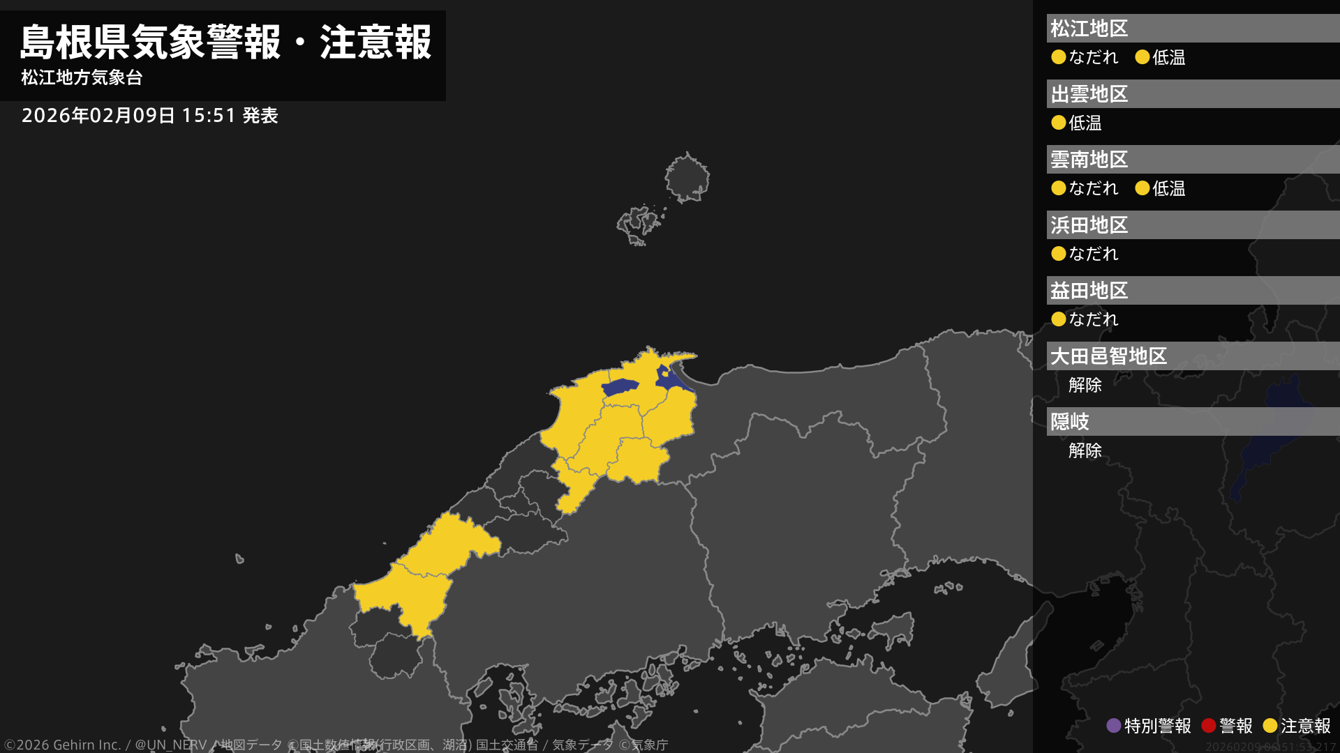 【島根県 気象警報・注意報 2026年02月09日 15:51】西部では10日まで、東部では11日まで、なだれに注意してください。東部では、10日まで低温に注意してください。#気象警報注意報 #島根県