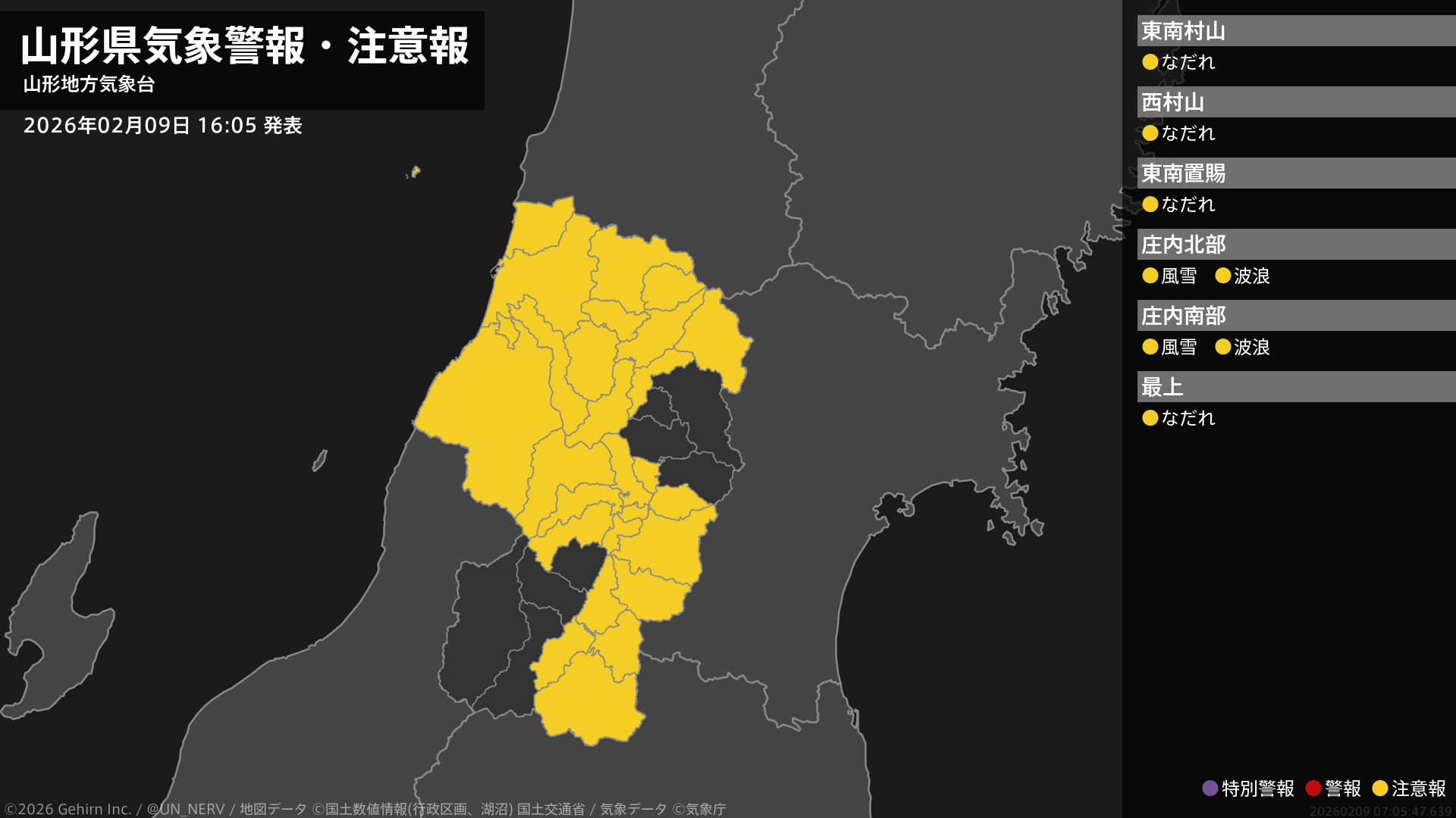 【山形県 気象警報・注意報 2026年02月09日 16:05】庄内では、9日夜遅くまで風雪に、10日明け方まで高波に注意してください。村山、置賜、最上では、9日までなだれに注意してください。#気象警報注意報 #山形県