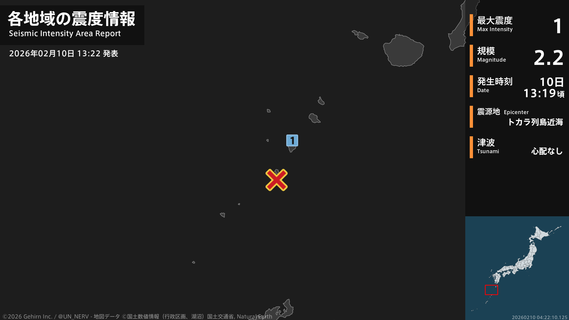 【地震情報 2026年2月10日】13時19分頃、トカラ列島近海を震源とする地震がありました。震源の深さはごく浅い、地震の規模はM2.2、最大震度1を鹿児島県で観測しています。この地震による津波の心配はありません。#地震 #鹿児島県