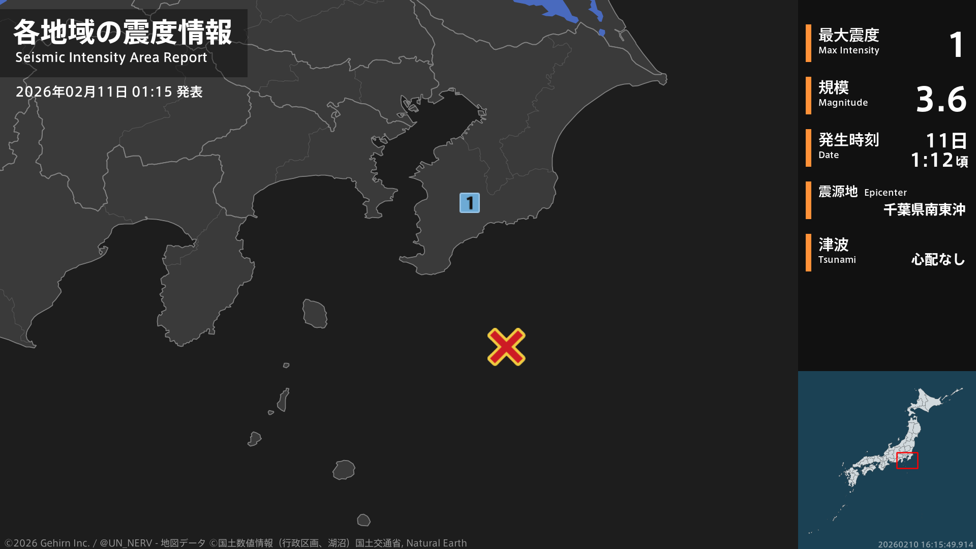 【地震情報 2026年2月11日】1時12分頃、千葉県南東沖を震源とする地震がありました。震源の深さは約60km、地震の規模はM3.6、最大震度1を千葉県で観測しています。この地震による津波の心配はありません。#地震 #千葉県