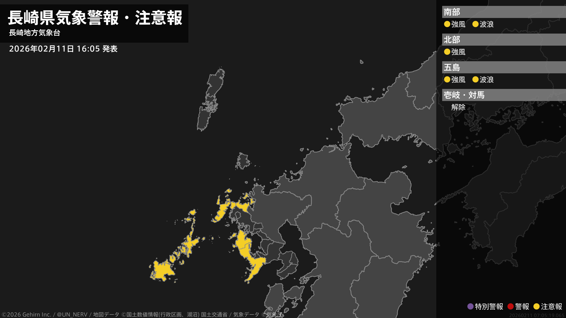 【長崎県 気象警報・注意報 2026年02月11日 16:05】南部、北部、五島では、11日夜遅くまで強風に注意してください。南部、五島では、11日夜遅くまで高波に注意してください。#気象警報注意報 #長崎県