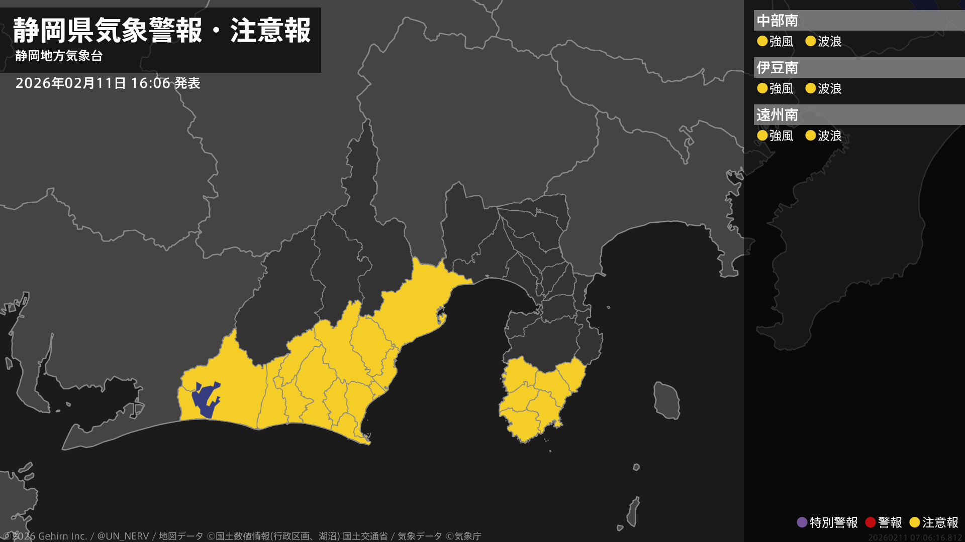 【静岡県 気象警報・注意報 2026年02月11日 16:06】中部、伊豆、西部では、11日夜遅くまで強風に、12日明け方まで高波に注意してください。#気象警報注意報 #静岡県