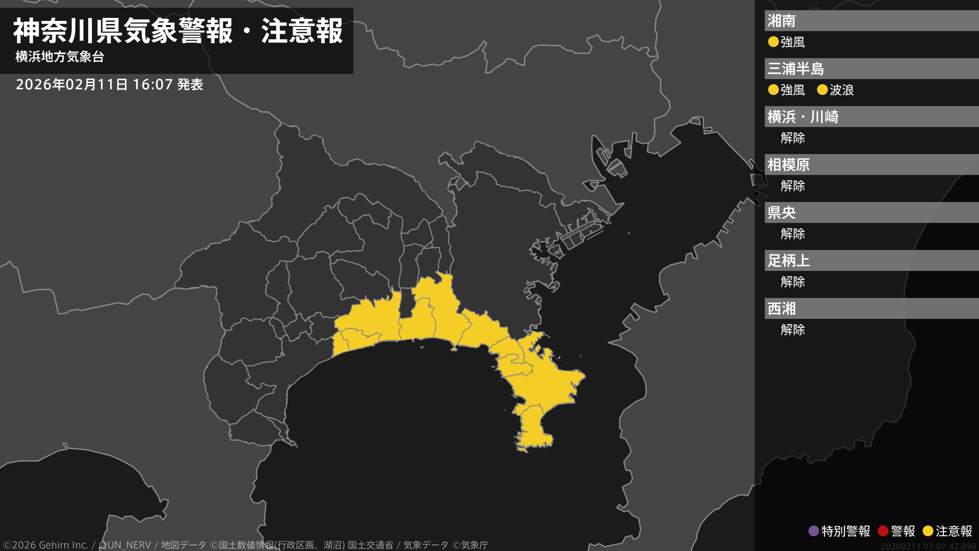 【神奈川県 気象警報・注意報 2026年02月11日 16:07】東部では、11日夜のはじめ頃から12日明け方まで強風に、12日朝まで高波に注意してください。#気象警報注意報 #神奈川県