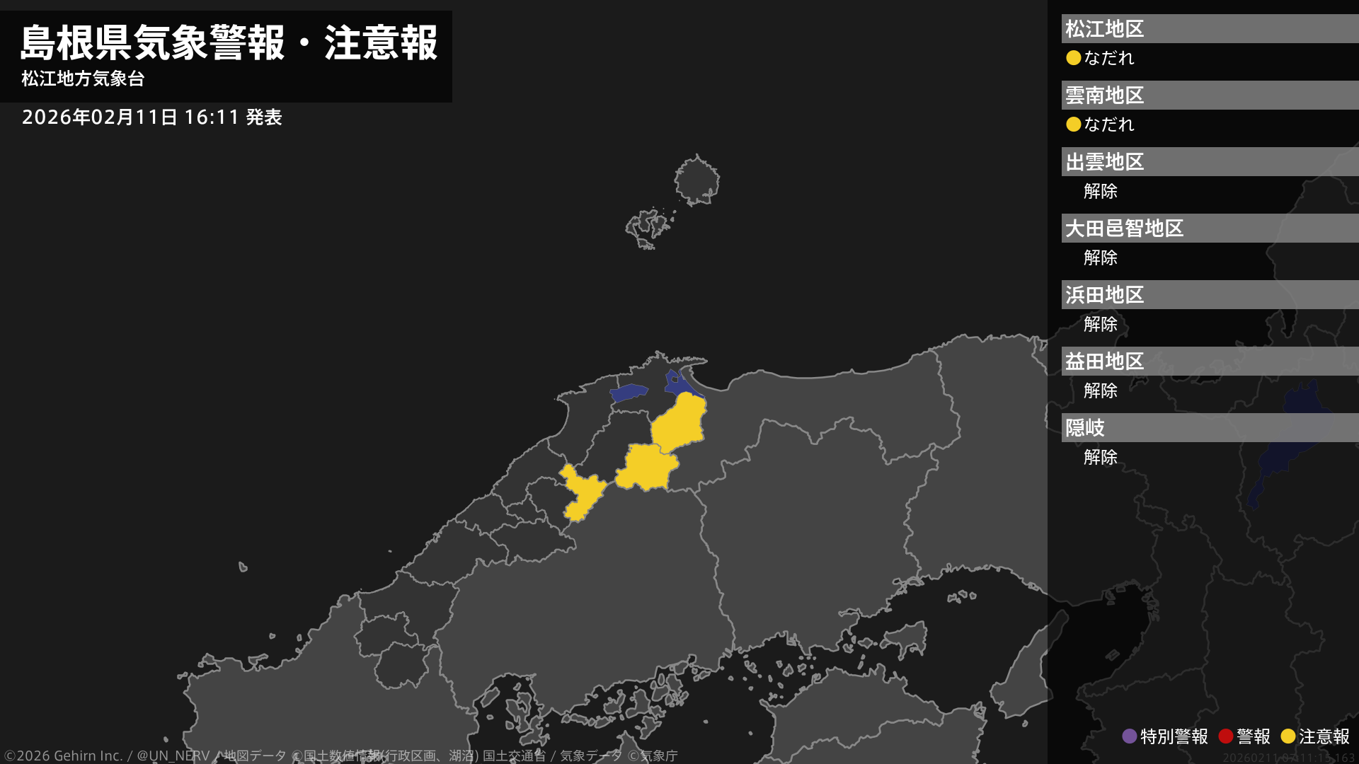 【島根県 気象警報・注意報 2026年02月11日 16:11】東部では、13日までなだれに注意してください。#気象警報注意報 #島根県