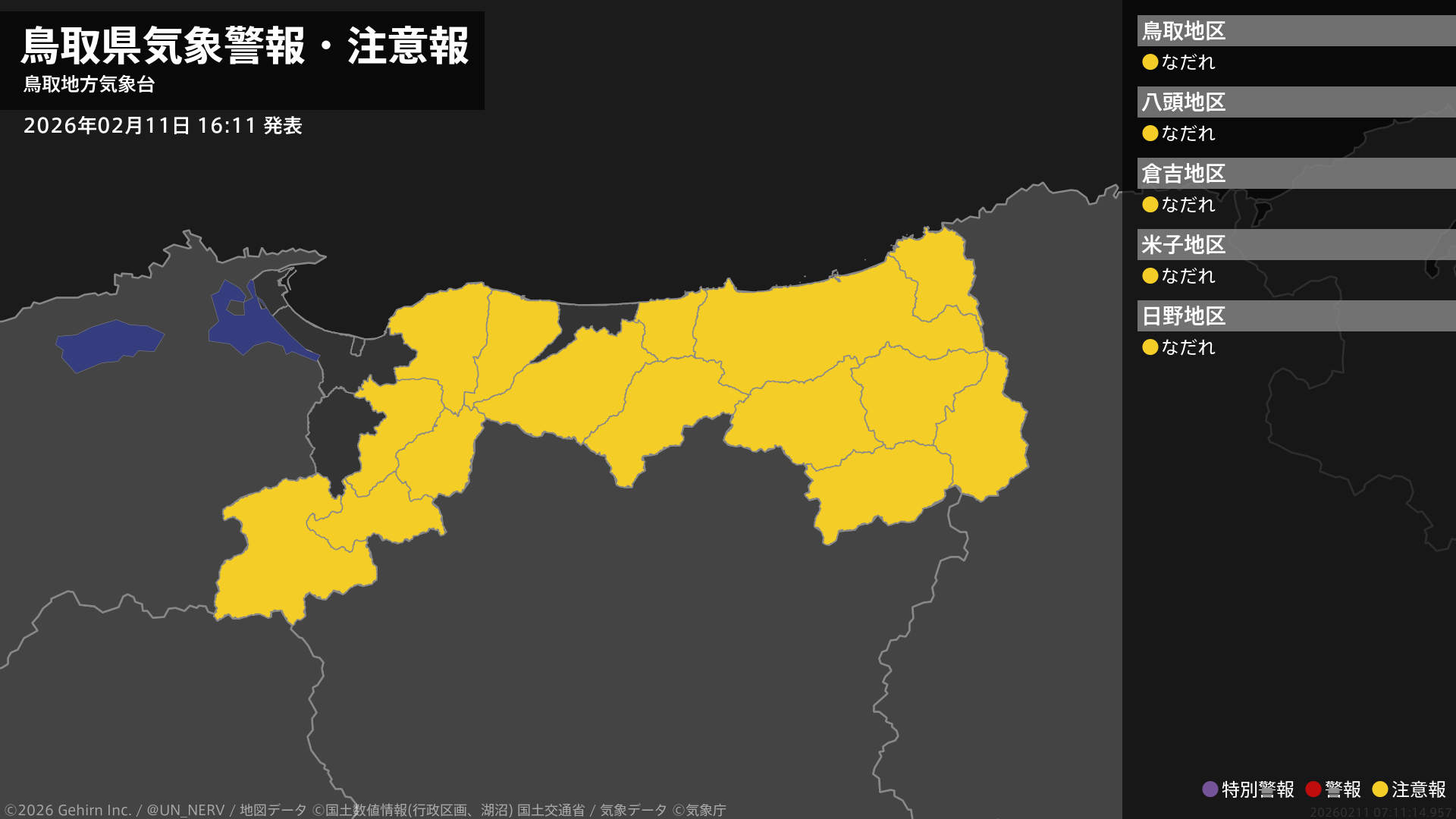 【鳥取県 気象警報・注意報 2026年02月11日 16:11】鳥取県では、13日までなだれに注意してください。#気象警報注意報 #鳥取県