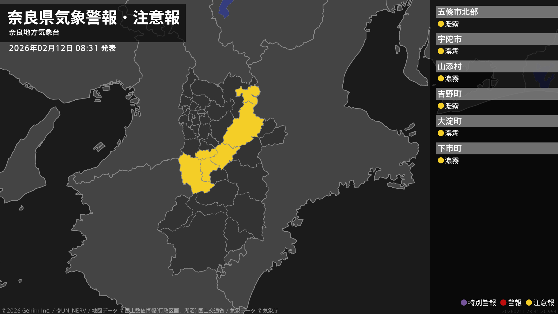 【奈良県 気象警報・注意報 2026年02月12日 08:31】北部では、12日昼前まで濃霧による視程障害に注意してください。#気象警報注意報 #奈良県