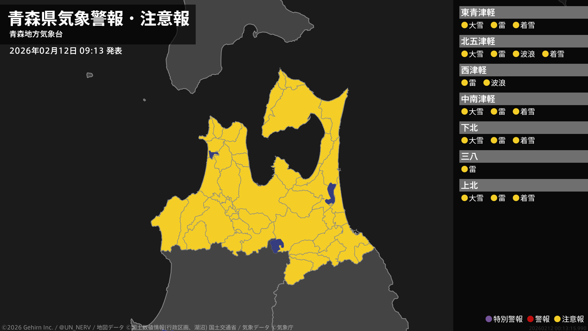【青森県 気象警報・注意報 2026年02月12日 09:13】青森県では、12日夜のはじめ頃まで大雪や電線等への着雪に、12日夕方まで落雷に注意してください。津軽では、12日夜遅くまで高波に注意してください。#気象警報注意報 #青森県