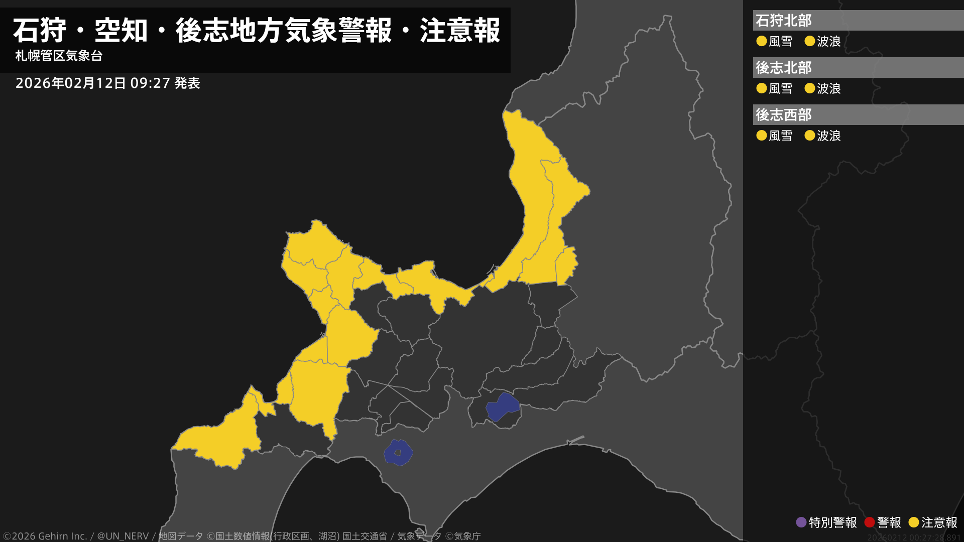 【石狩・空知・後志地方 気象警報・注意報 2026年02月12日 09:27】石狩、後志地方では、13日昼前まで風雪に、12日昼過ぎから12日夜遅くまで高波に注意してください。#気象警報注意報 #石狩地方 #後志地方