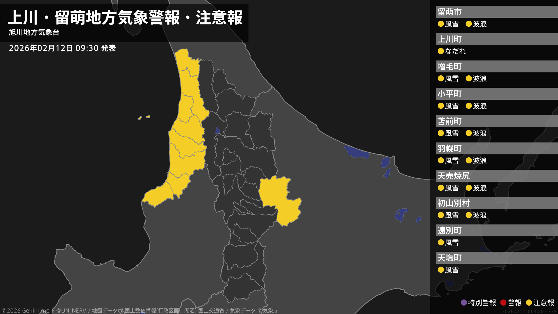 【上川・留萌地方 気象警報・注意報 2026年02月12日 09:30】留萌地方では、13日昼前まで風雪に、12日昼過ぎから12日夜遅くまで高波に注意してください。上川地方では、12日までなだれに注意してください。#気象警報注意報 #上川地方 #留萌地方