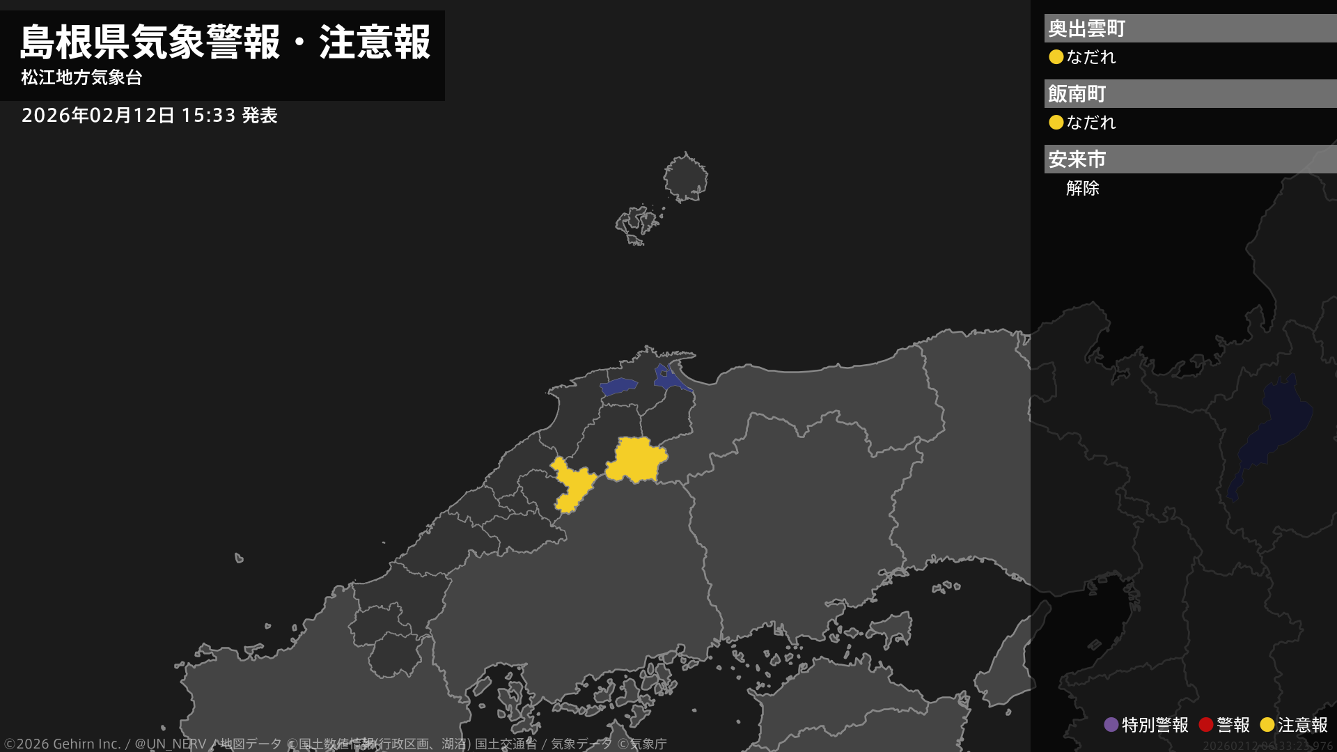 【島根県 気象警報・注意報 2026年02月12日 15:33】東部では、14日までなだれに注意してください。#気象警報注意報 #島根県