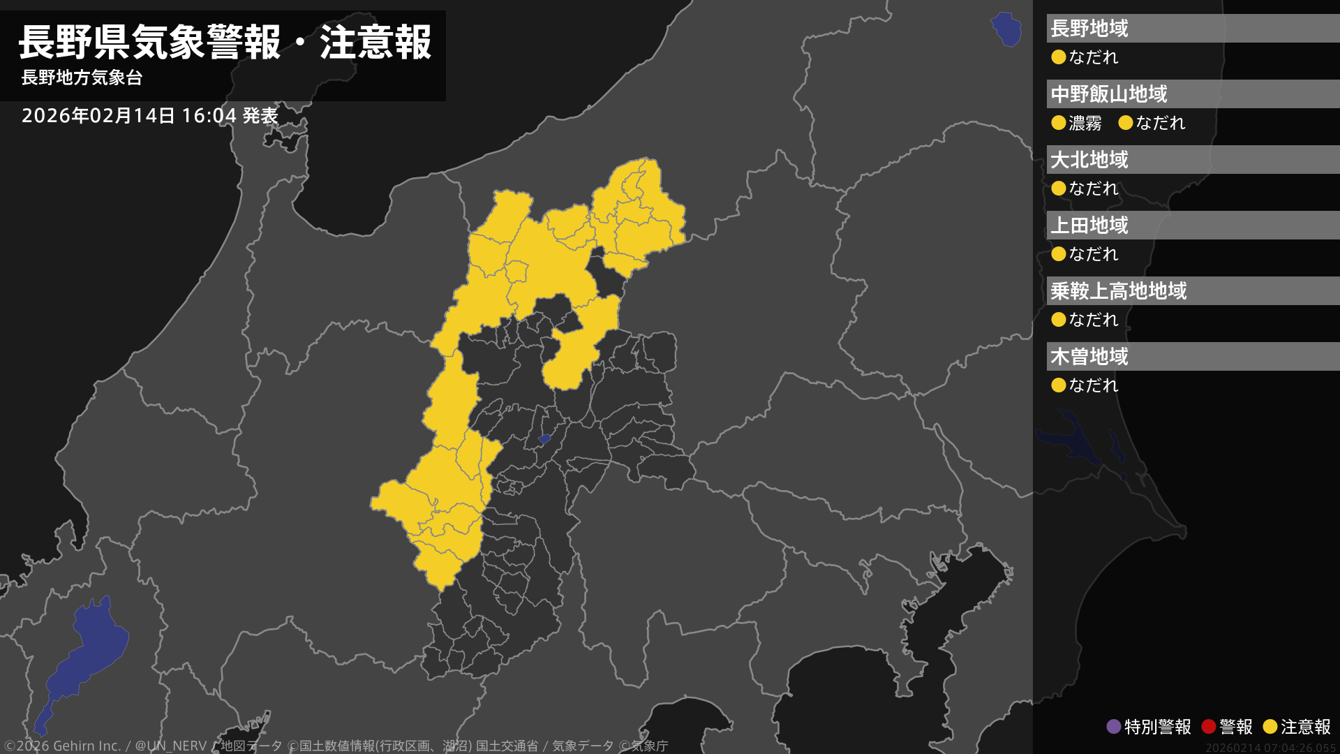 【長野県 気象警報・注意報 2026年02月14日 16:04】北部では、15日未明から15日昼前まで濃霧による視程障害に注意してください。長野県では、15日までなだれに注意してください。#気象警報注意報 #長野県